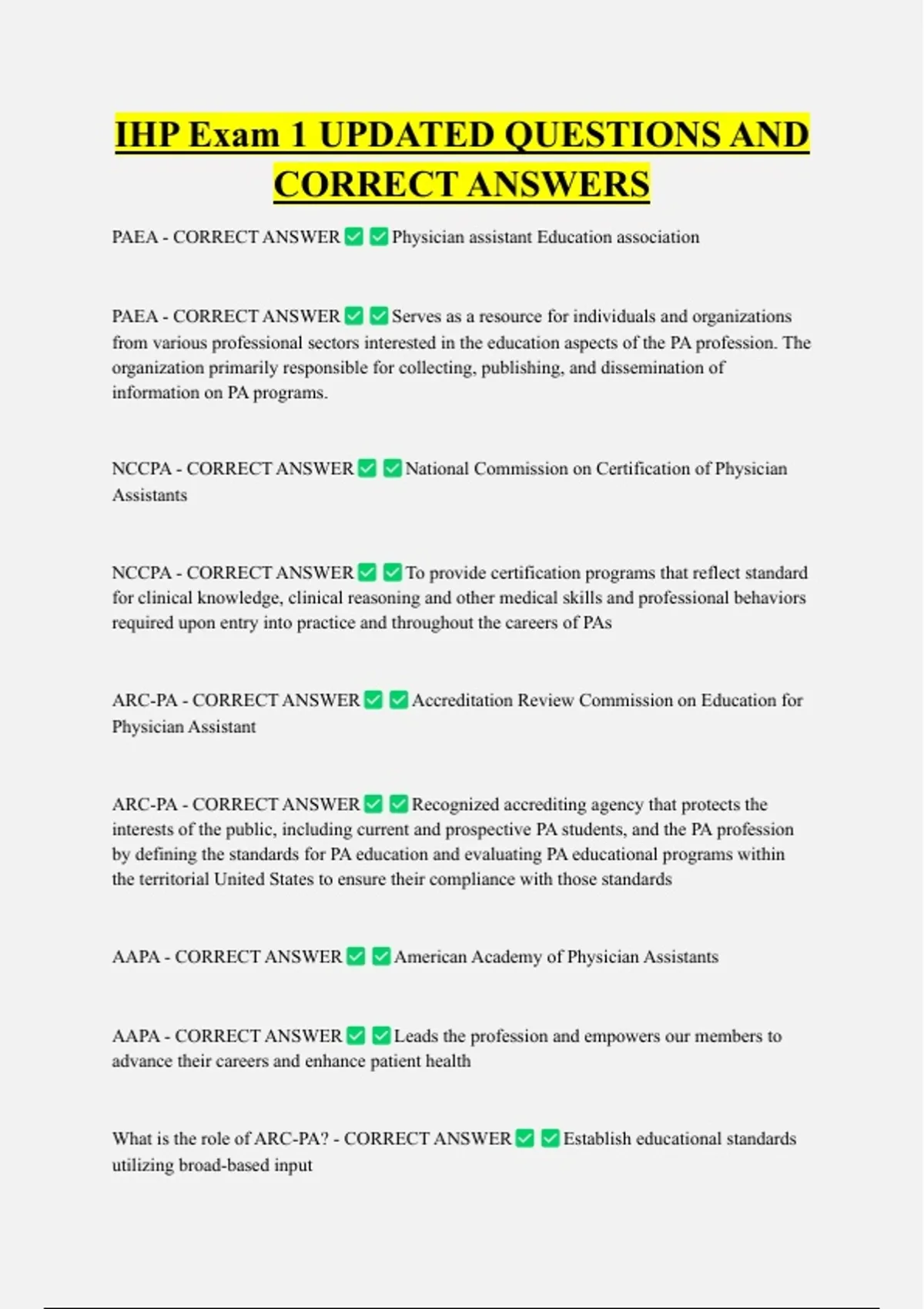 IHP Exam 1 UPDATED QUESTIONS AND CORRECT ANSWERS PAEA - CORRECT ANSWER PAEA - CORRECT ANSWER Physician assistant Education association Serves as a resource for individuals and organizations from various professional sectors interested in the education aspects of the PA profession. The organization primarily responsible for collecting, publishing, and dissemination of information on PA programs. NCCPA - CORRECT ANSWER Assistants NCCPA - CORRECT ANSWER National Commission on Certification of Physician To provide certification programs that reflect standard for clinical knowledge, clinical reasoning and other medical skills and professional behaviors required upon entry into practice and throughout the careers of PAs