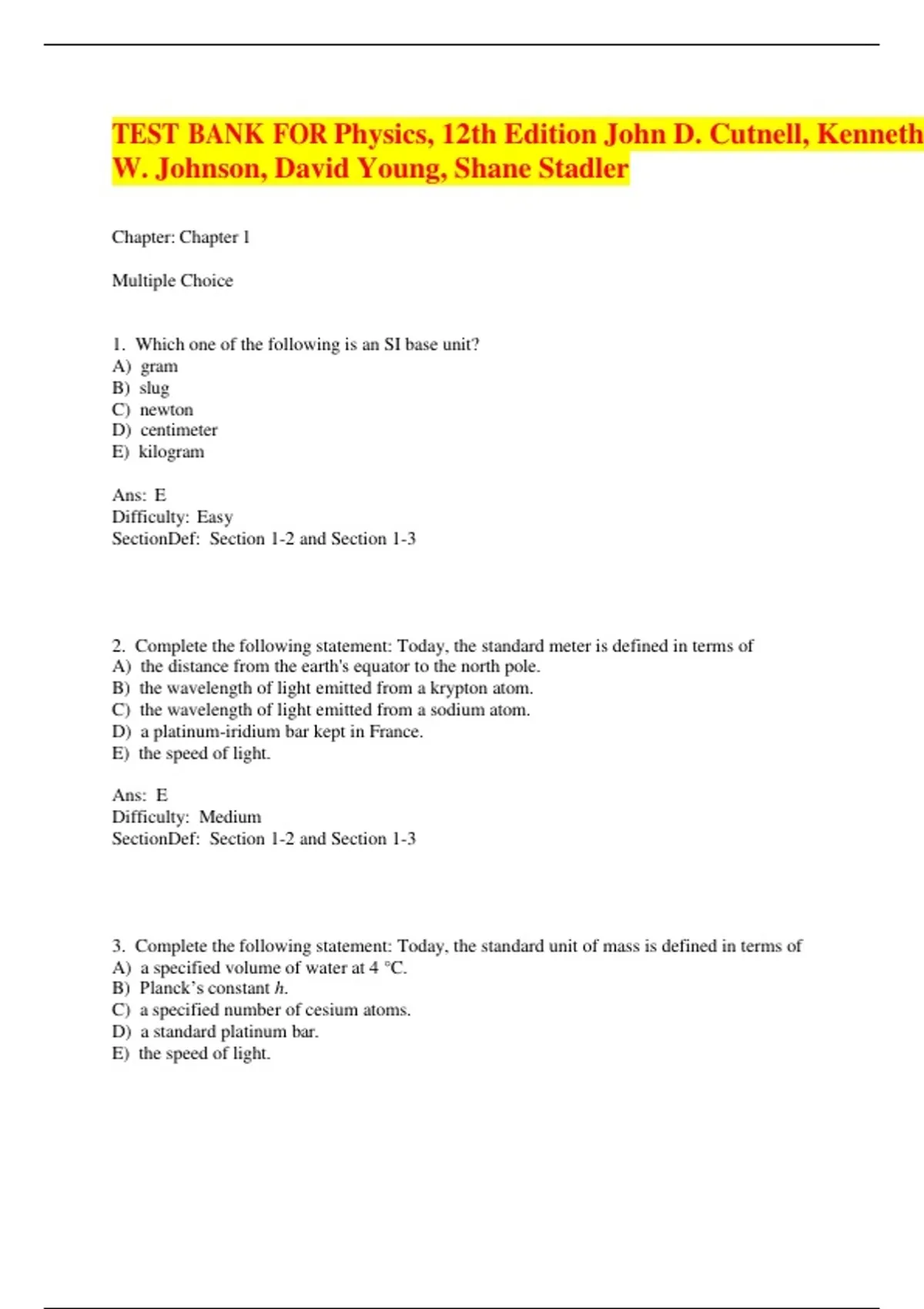 TEST BANK FOR Physics, 12th Edition John D. Cutnell, Kenneth