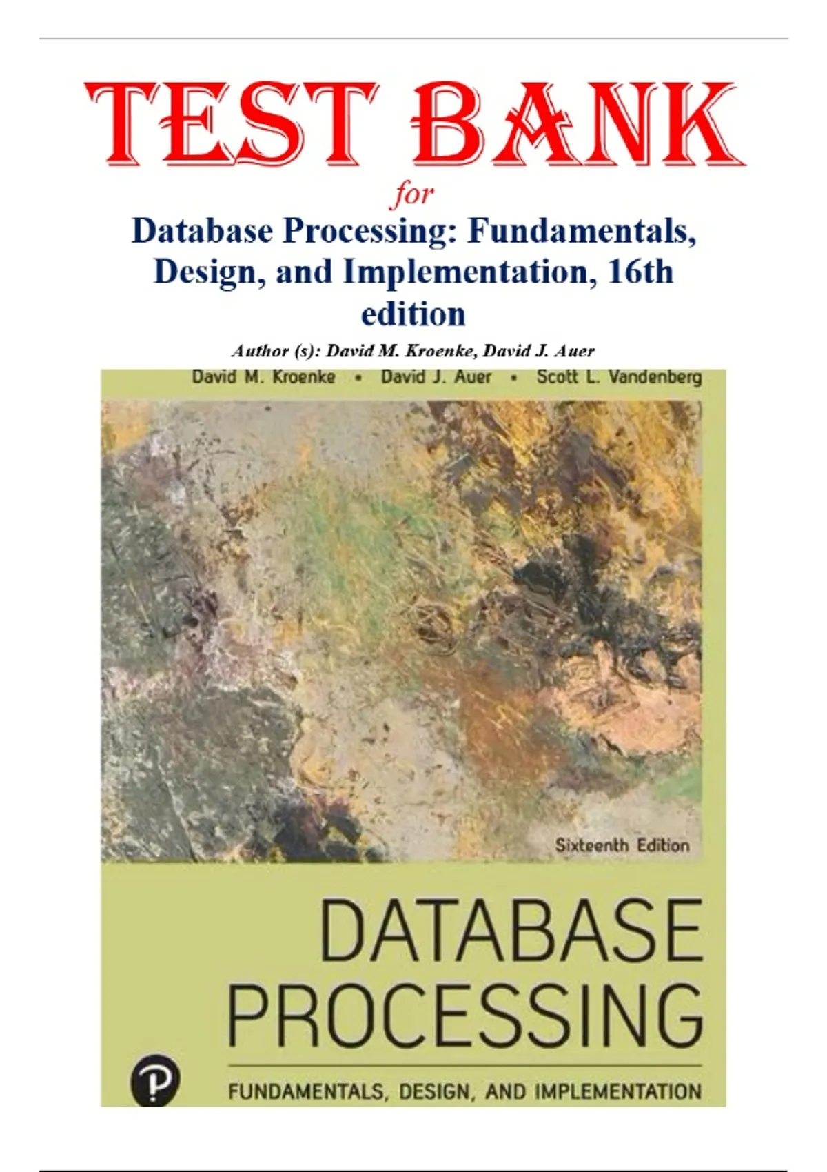 The Test Bank for Database Processing: Fundamentals, Design, and Implementation, 16th Edition by David M. Kroenke and David J. Auer delivers a complete collection of assessment materials—multiple choice, true/false, matching, short answer, and applied problem-solving questions—designed to align precisely with each chapter of the textbook. Instructors can use this resource to build quizzes, exams, and review exercises that reflect the depth and structure of the 16th edition. The content follows the official text organization. Part I: Getting Started introduces the foundations with Introduction and Introduction to Structured Query Language (SQL). Part II: Database Design moves into theory and modeling, covering The Relational Model and Normalization, Database Design Using Normalization, Data Modeling with the Entity-Relationship Model, and Transforming Data Models into Database Designs. Part III: Database Implementation emphasizes applied SQL and optimization through SQL for Database Construction and Application Processing and Database Redesign. Part IV: Enterprise Database Processing addresses system-level management, with chapters on Managing Enterprise Databases and Managing Databases with Microsoft SQL Server 2019, Oracle Database, MySQL 8.0, and ArangoDB, supported by online supplements. Finally, Part V: Database Access Standards and Technology explores advanced topics through The Web Server Environment, Data Warehouses and Business Intelligence Systems, and Big Data, NoSQL, and the Cloud.