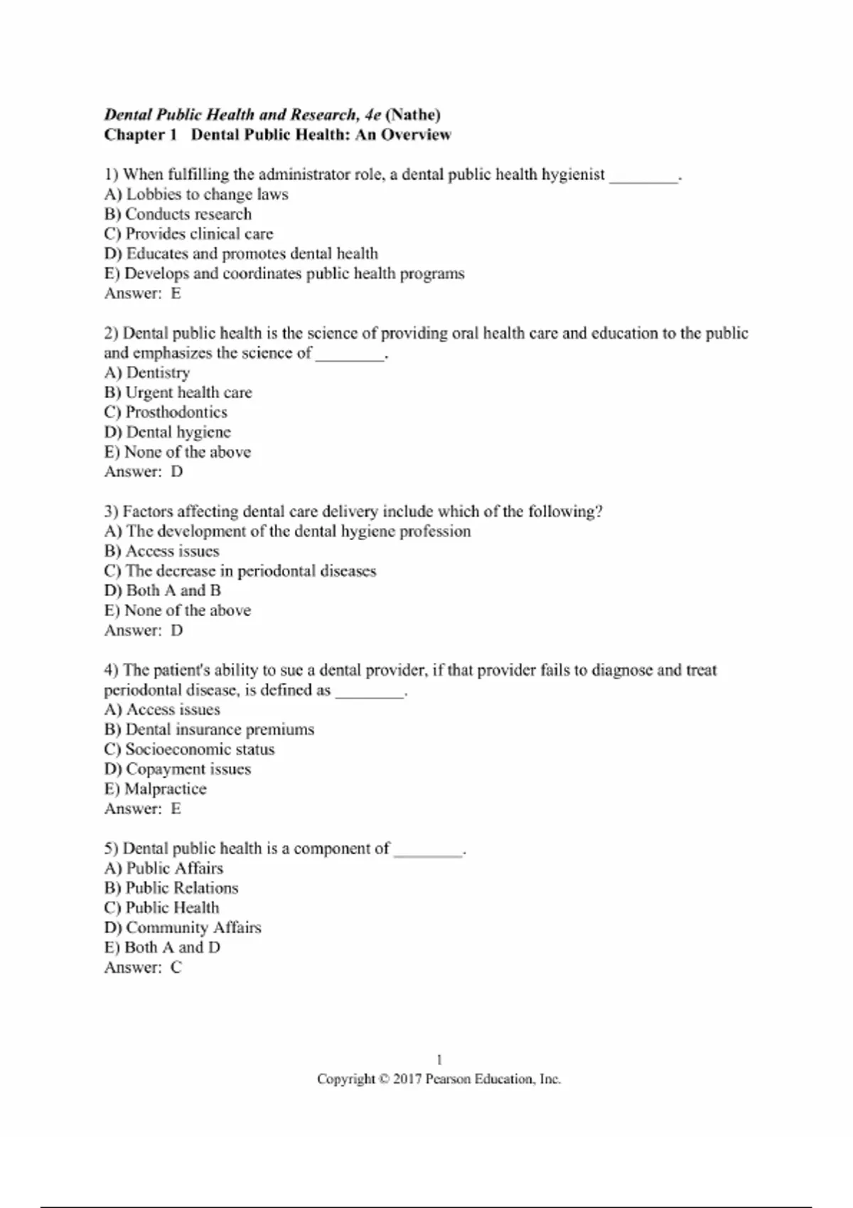 The Test Bank for Dental Public Health & Research: Contemporary Practice for the Dental Hygienist, 4th Edition by Christine N. Nathe provides instructors with a fully developed set of assessment tools keyed precisely to every chapter of the textbook. It includes multiple-choice, true/false, matching, short answer, and scenario-based questions designed to assess understanding of public health, research methods, epidemiology, program planning, and health promotion from a dental hygiene perspective. In UNIT ONE, chapters such as Dental Public Health, The Evolution of the Prevention Movement, Dental Care Delivery in the U.S. and globally, Funding of Dental Care, Legislative Initiatives, and Change Agents in Dental Care are covered with questions probing core public health concepts and policy implications. In UNIT TWO, the Test Bank spans Dental Health Education and Promotion, Lesson Plan Development, Target Populations, Cultural Diversity, Program Planning, and Program Evaluation, assessing both conceptual knowledge and application in community settings. UNIT THREE’s chapters—Research in Dental Hygiene, Ethical Principles, Research Approaches, Biostatistics, Oral Epidemiology, and Evaluation of Scientific Literature and Dental Products—are addressed with questions testing research design, data interpretation, and critical appraisal. Finally, UNIT FOUR—containing Careers in Dental Public Health, Strategies for Creating Positions, and Dental Public Health Board Review—is supported by test items aimed at policy, leadership, and professional preparedness.