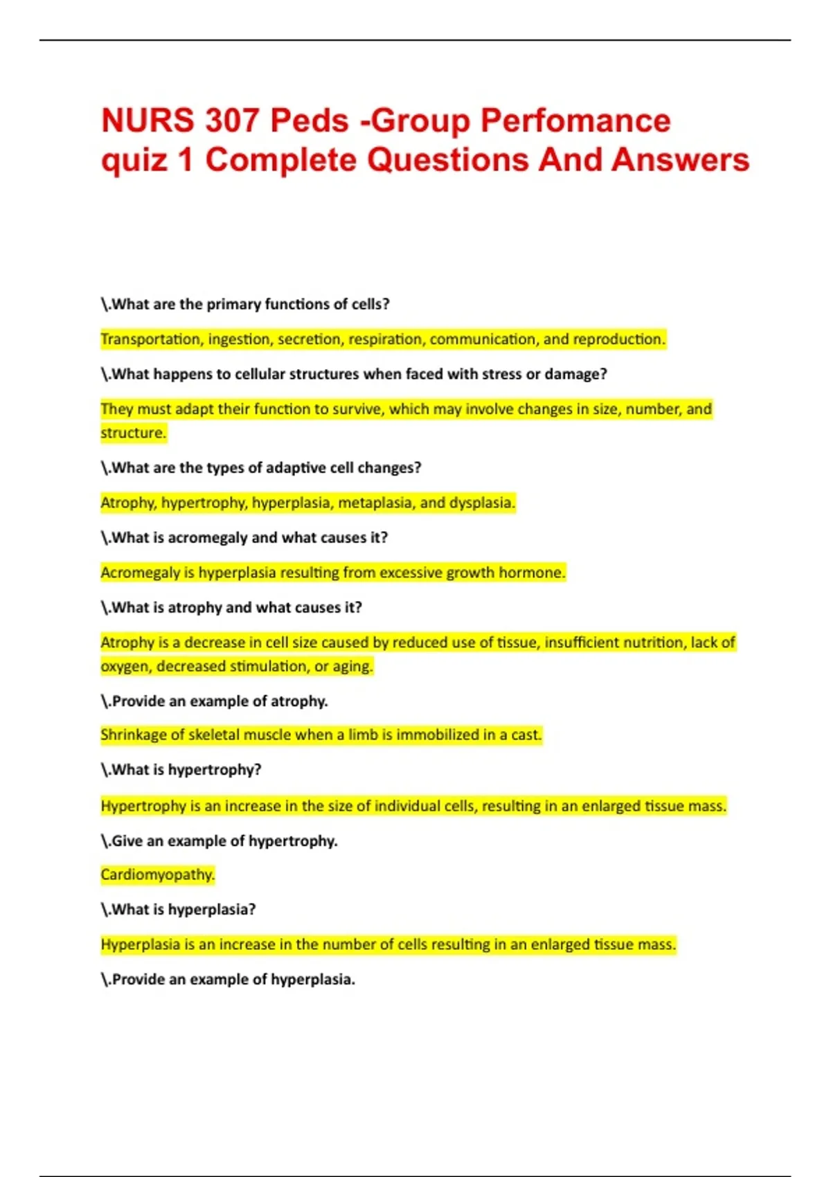NURS 307 Peds -Group Perfomance quiz 1 Complete Questions And Answers .What are the primary functions of cells? Transportation, ingestion, secretion, respiration, communication, and reproduction. .What happens to cellular structures when faced with stress or damage? They must adapt their function to survive, which may involve changes in size, number, and structure. .What are the types of adaptive cell changes? Atrophy, hypertrophy, hyperplasia, metaplasia, and dysplasia. .What is acromegaly and what causes it? Acromegaly is hyperplasia resulting from excessive growth hormone. .What is atrophy and what causes it? Atrophy is a decrease in cell size caused by reduced use of tissue, insufficient nutrition, lack of oxygen, decreased stimulation, or aging. .Provide an example of atrophy. Shrinkage of skeletal muscle when a limb is immobilized in a cast. .What is hypertrophy? Hypertrophy is an increase in the size of individual cells, resulting in an enlarged tissue mass. .Give an example of hypertrophy. Cardiomyopathy. .What is hyperplasia? Hyperplasia is an increase in the number of cells resulting in an enlarged tissue mass. .Provide an example of hyperplasia. Prostatic hyperplasia. .What is metaplasia? Metaplasia is when one mature cell type is replaced by a different mature cell type. .What is an example of metaplasia? Exposure to cigarette smoke. .What is dysplasia? Dysplasia refers to changes in cell size, shape, uniformity, arrangement, and structure, often with large nuclei and increased mitosis. .What are the characteristics of cells in dysplasia? Large nuclei, increased mitosis, and changes in cell structure. .What is the difference between reversible and irreversible cellular injury? Reversible injury allows cells to recover, while irreversible injury results in cell death. .What are some causes of cell injury and death? Infection, physical injury, mechanical injury, thermal injury, chemical injury, toxins, and oxidative stress. .What are free radicals? Free radicals are molecules with an unpaired electron, making them highly unstable and reactive. .What physiological processes can lead to the formation of free radicals? Aerobic cell metabolism and fighting pathogens. .What is oxidative stress? Oxidative stress occurs when there is an imbalance between free radicals and antioxidants in the body. .What is the significance of cellular adaptations in response to stress? Cellular adaptations are crucial for survival under stress, allowing cells to maintain function despite adverse conditions. .What does wildly pleomorphic cells indicate in the context of dysplasia? Wildly pleomorphic cells indicate anaplasia, which is a severe form of dysplasia. .What are reactive oxygen species (ROS)? Toxic oxygen molecules formed during mitochondrial respiration, including superoxide (O2-) and hydrogen peroxide (H2O2). .What can increase the production of free radicals? Exposure to pollutants, chemicals, sunlight, alcohol, and infections. .What is free radical injury? Cellular damage resulting from reactive oxygen species, including damage to DNA, RNA, lipids, and proteins. .What are the harmful effects of excessive ROS on cells? Cellular damage, mitochondrial damage, and potential apoptosis. .What illnesses can result from excess reactive oxygen species? Heart disease, diabetes, and cancer. .What are the two types of antioxidants? Enzymatic and non-enzymatic antioxidants. .Name an example of an enzymatic antioxidant and its function. Superoxide dismutase (SOD) catalyzes superoxide into hydrogen peroxide and oxygen. .What is the role of catalase in antioxidant defense? Catalase converts hydrogen peroxide into water. .What are some examples of non-enzymatic antioxidants? Vitamin E, Vitamin C, glutathione, and selenium. .What happens during hypoxic injury? Cellular injury due to reduced oxygen availability, which can result from various respiratory and cardiovascular issues. .What is ischemia? A condition characterized by reduced blood flow, leading to hypoxia. .What is ischemia-reperfusion injury?