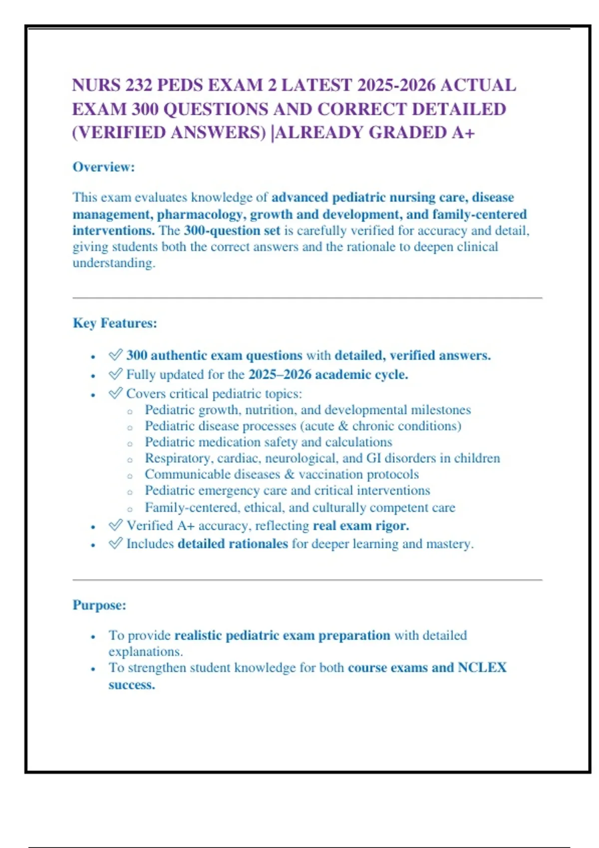 The NURS 232 Pediatrics Exam 2 (2025–2026) resource provides 300 real exam-style questions with detailed, verified answers. Updated to reflect the latest testing standards, this exam prep ensures comprehensive coverage of pediatric nursing concepts and prepares students for success.