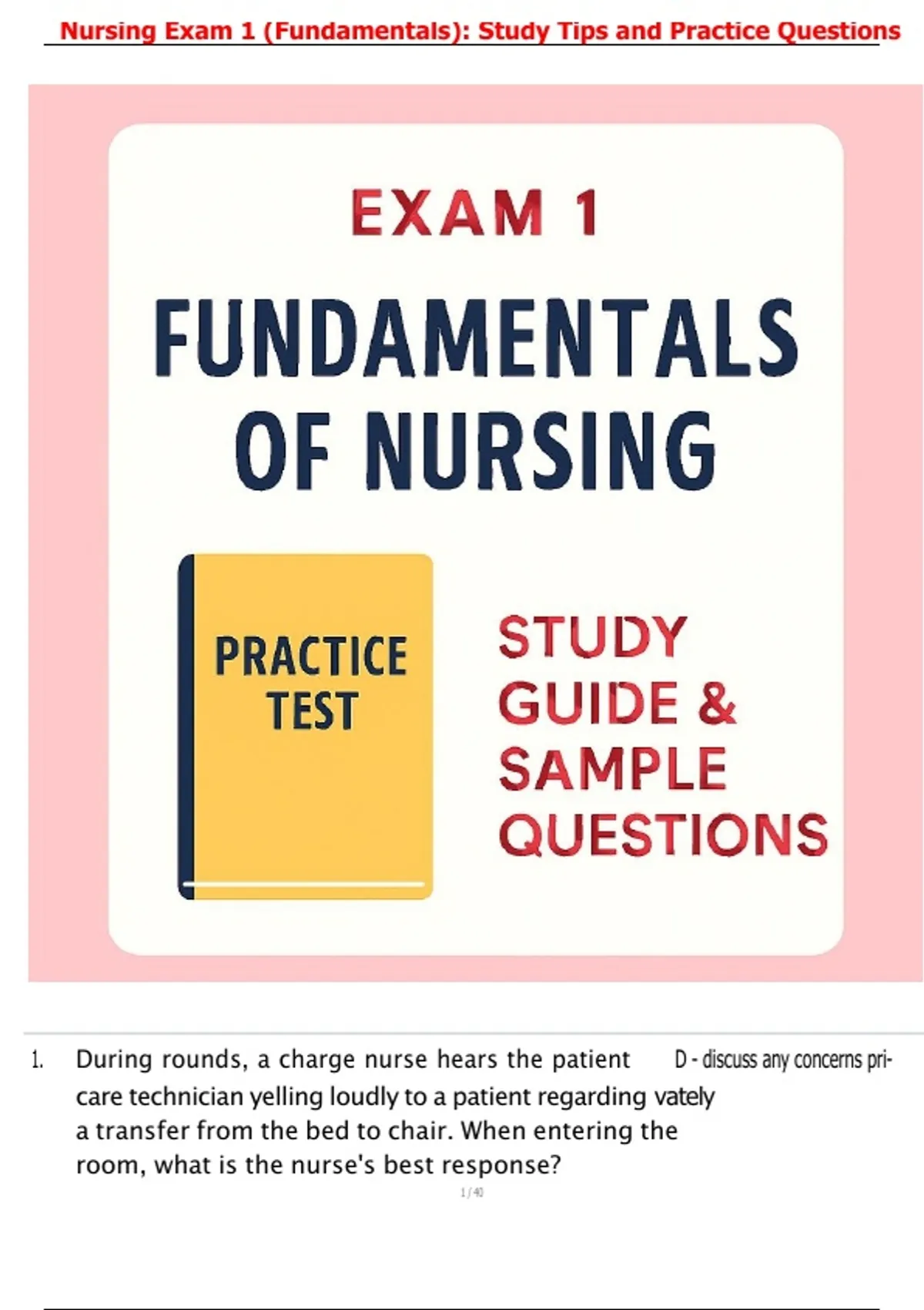 Prepare for success with our Fundamentals of Nursing Exam 1 study guide, designed to help nursing students master essential concepts and build confidence. This resource includes nursing exam practice questions, detailed explanations, and study tips tailored to Exam 1. Whether you’re reviewing nursing fundamentals test questions or looking for a quick exam 1 nursing review, this guide provides the tools you need to strengthen your knowledge and improve test performance. Perfect for students seeking a reliable nursing exam prep resource that combines clarity, accuracy, and practical strategies.