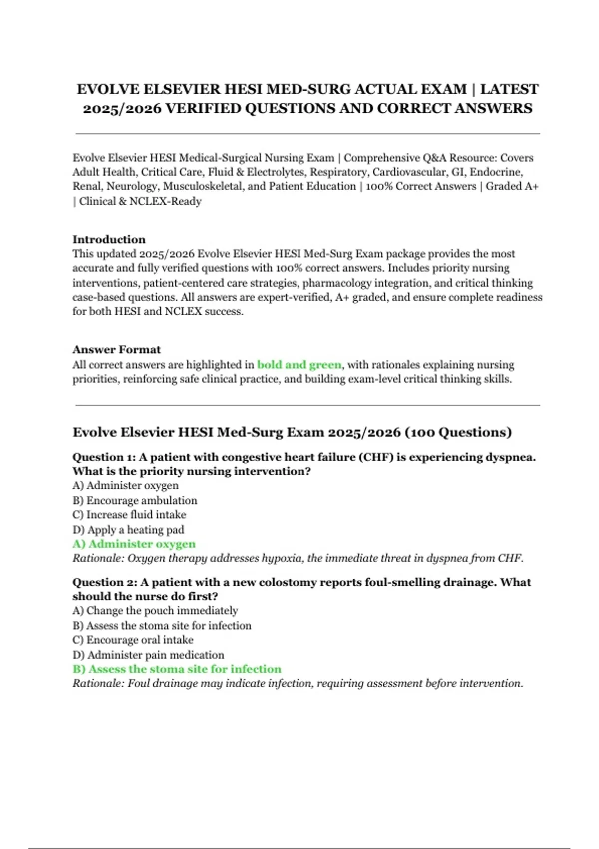 This 2025/2026 Evolve Elsevier HESI Medical-Surgical Nursing Exam resource provides the latest verified questions with 100% correct answers. It offers comprehensive coverage of adult health, critical care, fluid and electrolyte balance, respiratory, cardiovascular, gastrointestinal, endocrine, renal, neurological, and musculoskeletal systems. Additional focus is placed on patient education and clinical decision-making, ensuring alignment with NCLEX and clinical practice standards.