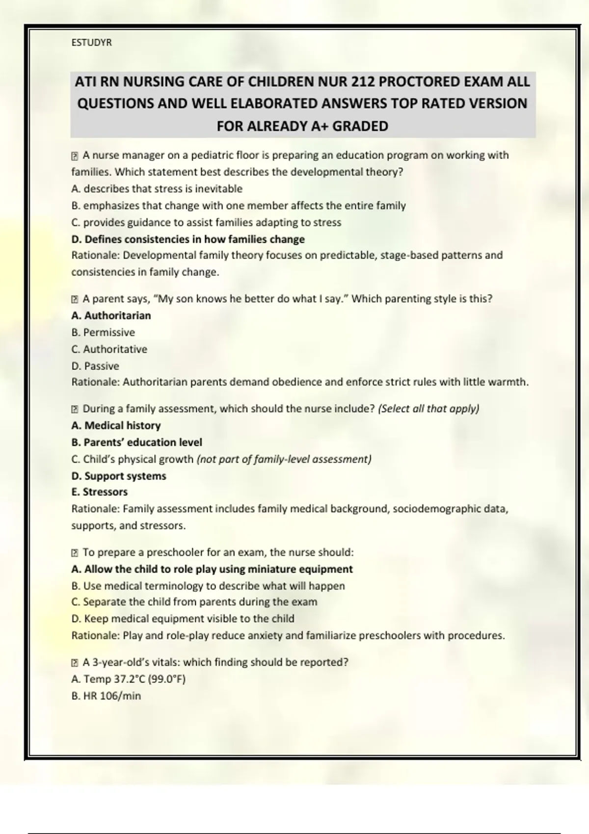 ATI RN NURSING CARE OF CHILDREN NUR 212 PROCTORED EXAM ALL