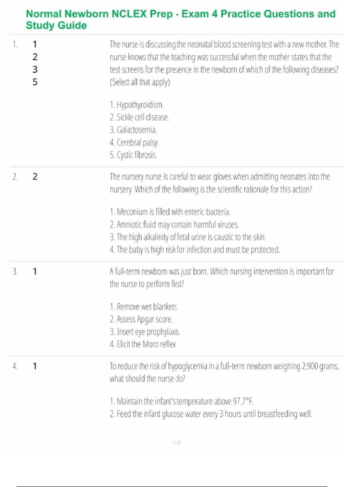 Normal Newborn NCLEX Prep - Exam 4 Practice Questions and Study Guide