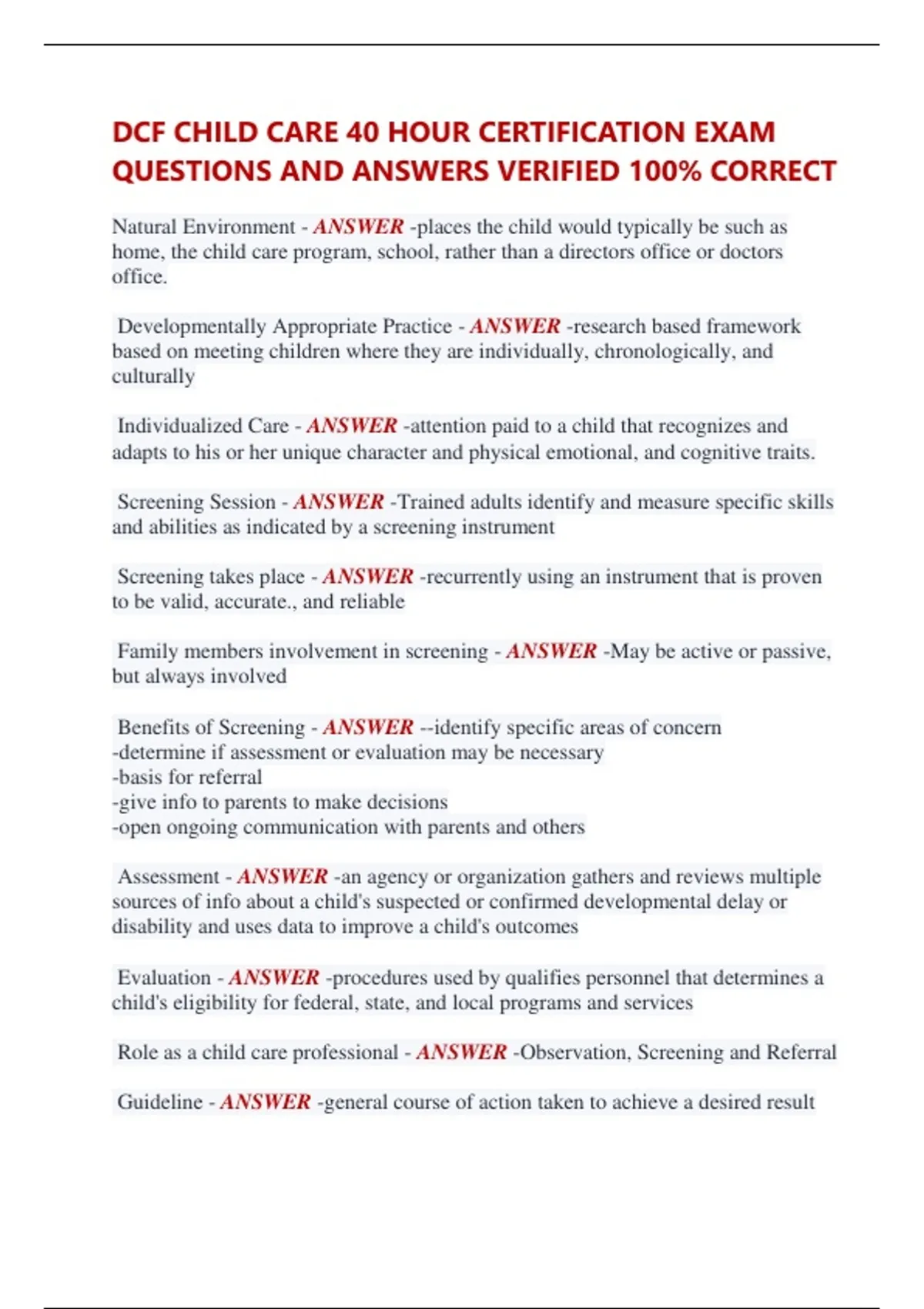 DCF CHILD CARE 40 HOUR CERTIFICATION EXAM QUESTIONS AND ANSWERS VERIFIED 100% CORRECT Natural Environment - ANSWER -places the child would typically be such as home, the child care program, school, rather than a directors office or doctors office. Developmentally Appropriate Practice - ANSWER -research based framework based on meeting children where they are individually, chronologically, and culturally Individualized Care - ANSWER -attention paid to a child that recognizes and adapts to his or her unique character and physical emotional, and cognitive traits. Screening Session - ANSWER -Trained adults identify and measure specific skills and abilities as indicated by a screening instrument Screening takes place - ANSWER -recurrently using an instrument that is proven to be valid, accurate., and reliable Family members involvement in screening - ANSWER -May be active or passive, but always involved Benefits of Screening - ANSWER --identify specific areas of concern -determine if assessment or evaluation may be necessary -basis for referral -give info to parents to make decisions -open ongoing communication with parents and others Assessment - ANSWER -an agency or organization gathers and reviews multiple sources of info about a child's suspected or confirmed developmental delay or disability and uses data to improve a child's outcomes Evaluation - ANSWER -procedures used by qualifies personnel that determines a child's eligibility for federal, state, and local programs and services Role as a child care professional - ANSWER -Observation, Screening and Referral Guideline - ANSWER -general course of action taken to achieve a desired result Best Practice - ANSWER -specific action taken by experts in the field to achieve a desired result Guidelines for Observation and Screening - ANSWER -Be informed, objective and accurate, honest and fair, focused Objectivity - ANSWER -ability to set aside personal beliefs, values, opinions and biases, and consider only facts Subjectivity - ANSWER -involves the application of one's point of view when determining a course of thought or action Presumption - ANSWER -a belief about something or someone formed before experience shows it is true Good Faith - ANSWER -moral concept that means to work with sincere intention of doing the right thing, with honesty and integrity and perform with best effort possible Validity - ANSWER -screening instruments soundness and legitimacy Correlated - ANSWER -related Replicated - ANSWER -repeated Involving families in the prcoess - ANSWER --permission to screen -enrollment info -results of previous screenings -health records -family dynamics -health issues -written consent Confidentiality - ANSWER -keeping personal info private Quality programs have developmentally appropriate screening schedule for each child and share it with the parents. The American Academy of Pediatrics recommends screenings at: - ANSWER --9 months -18 months -24 months or 30 months Child care professionals should: - ANSWER -select the right screening tools, ask the right questions, follow guidelines and best practices, involve families checklist - ANSWER -a list of skills and abilities to be observed. anecdotal record - ANSWER -write about the development of a skill or ability after it has occured conversations - ANSWER -word for word accounts of what children said while being interviewed by a provider can be phonetically, non verbal communication and body language also included document children's ability to translate words into thoughts documentation - ANSWER -everything in a child's file in regards to observation- refers to records that help identify a child who may be at risk of maltreatment, delay, disability or to relay a suspicion of child abuse frequency count - ANSWER -how often a behavior happens identify how often behaviors to be addressed or accommodated running record - ANSWER -write about what is happening while you are observing standardized test - ANSWER -compare a child's development to other children of the same age. ability to compare contrast, solve problems, classify objects, put things in order, arrive at conclusions tested time sample - ANSWER -document children's attention span. how much time they spend doing an activity work sample - ANSWER -observe a child's skill by using a product they have created can be 2d (drawing or writing) 3d (sculpture)