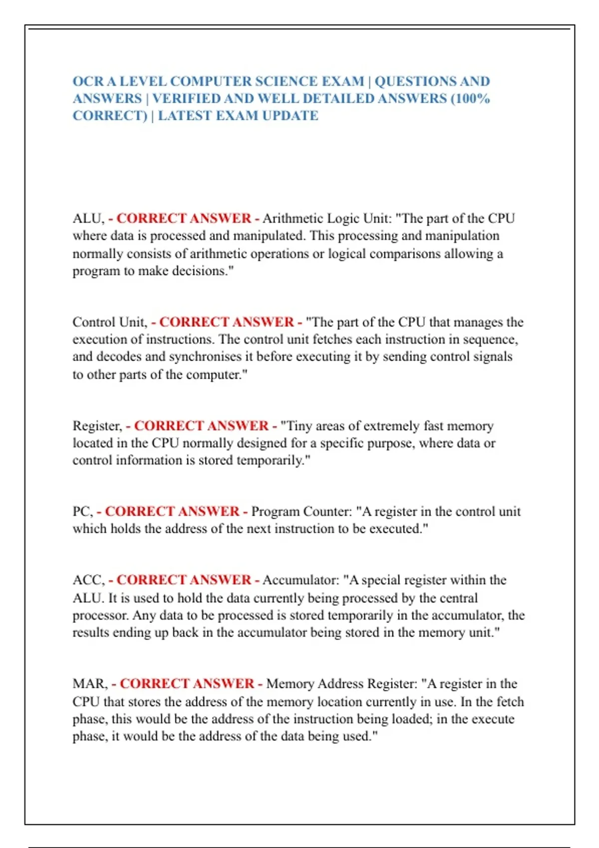 ALU, - CORRECT ANSWER - Arithmetic Logic Unit: "The part of the CPU