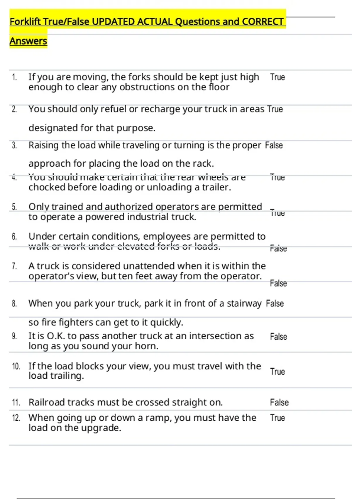 Forklift True/False UPDATED ACTUAL Questions and CORRECT
