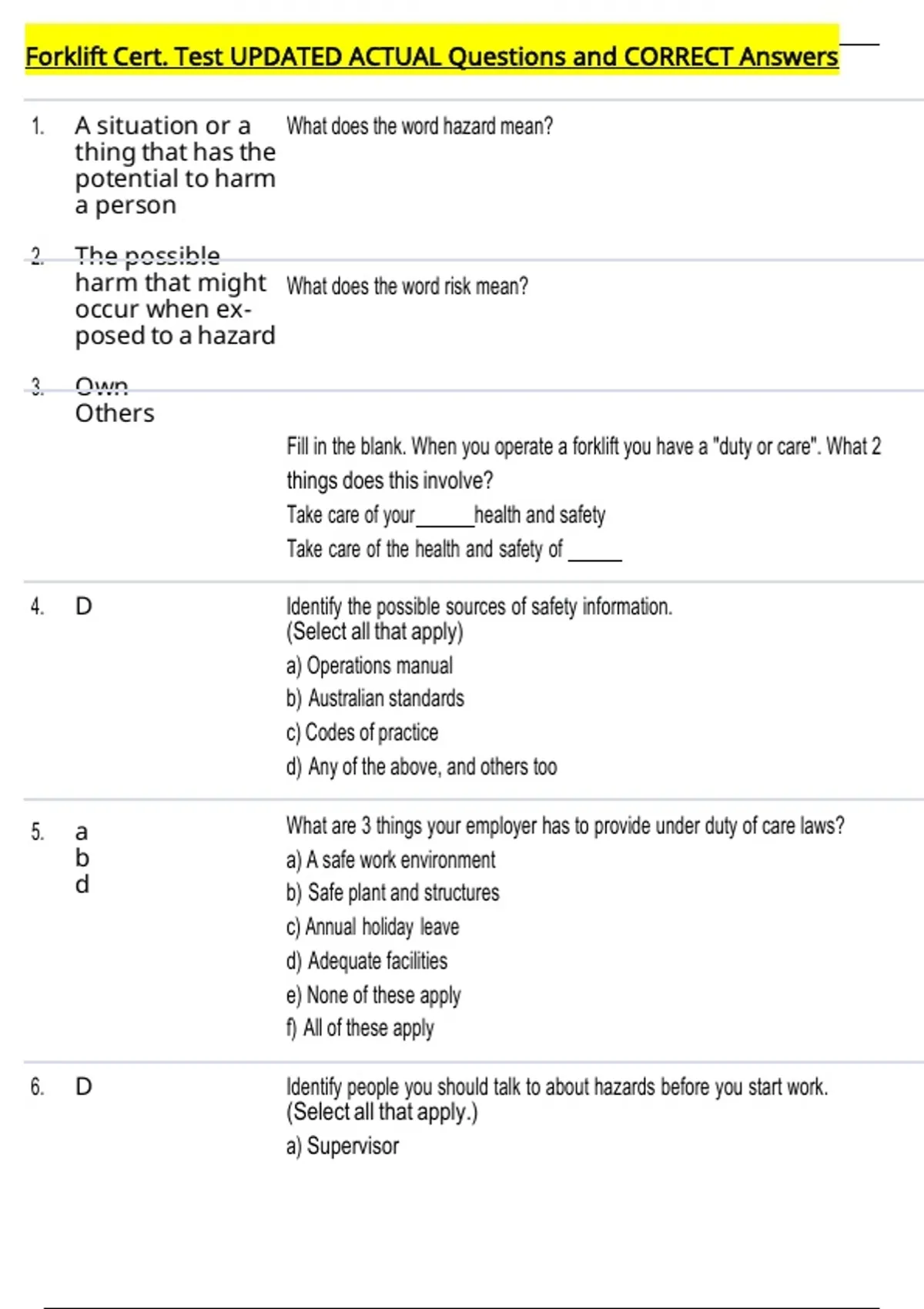 Forklift Cert. Test UPDATED ACTUAL Questions and CORRECT Answers