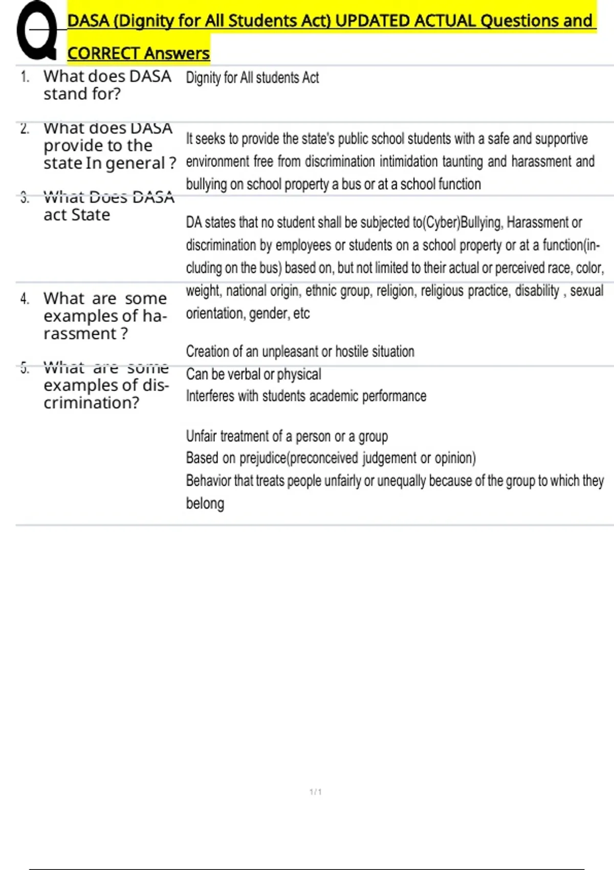 1. What does DASA Dignity for All students Act