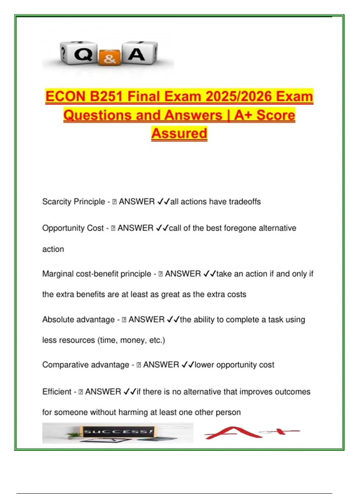 This expertly prepared and fully verified document contains over 120 solved questions from the 2025/2026 final exam for Econ B251 – Principles of Microeconomics. Designed for university students studying foundational economics, this resource offers comprehensive and precise coverage of all core topics needed to succeed in microeconomics exams. Topics include essential economic principles such as scarcity, opportunity cost, marginal analysis, and comparative vs. absolute advantage, progressing into in-depth analysis of market structures (perfect competition, monopoly), consumer and producer surplus, and elasticity. The document also features real-world application questions on public goods, externalities, deadweight loss, price ceilings/floors, and income taxation. Students are guided through concepts of utility maximization, rational spending rules, and behavioral decision-making, alongside advanced topics like game theory, dominant strategies, statistical discrimination, and price discrimination models. With clear answers, numerical reasoning, and scenario-based questions, this document is particularly useful for review, practice, or exam-day simulation. Recommended for students enrolled in: – Principles of Microeconomics (Econ B251 or equivalent) – Economics for Business, Finance, Public Policy, or Pre-Law – AP Microeconomics or CLEP Microeconomics prep – Intro-level university economics courses Keywords: microeconomics, scarcity, opportunity cost, marginal utility, market equilibrium, monopoly, perfect competition, consumer surplus, producer surplus, elasticity, price discrimination, rational choice, game theory, Nash equilibrium, supply and demand, public goods, externalities, deadweight loss, income tax, price controls, utility maximization, comparative advantage, cost-benefit analysis