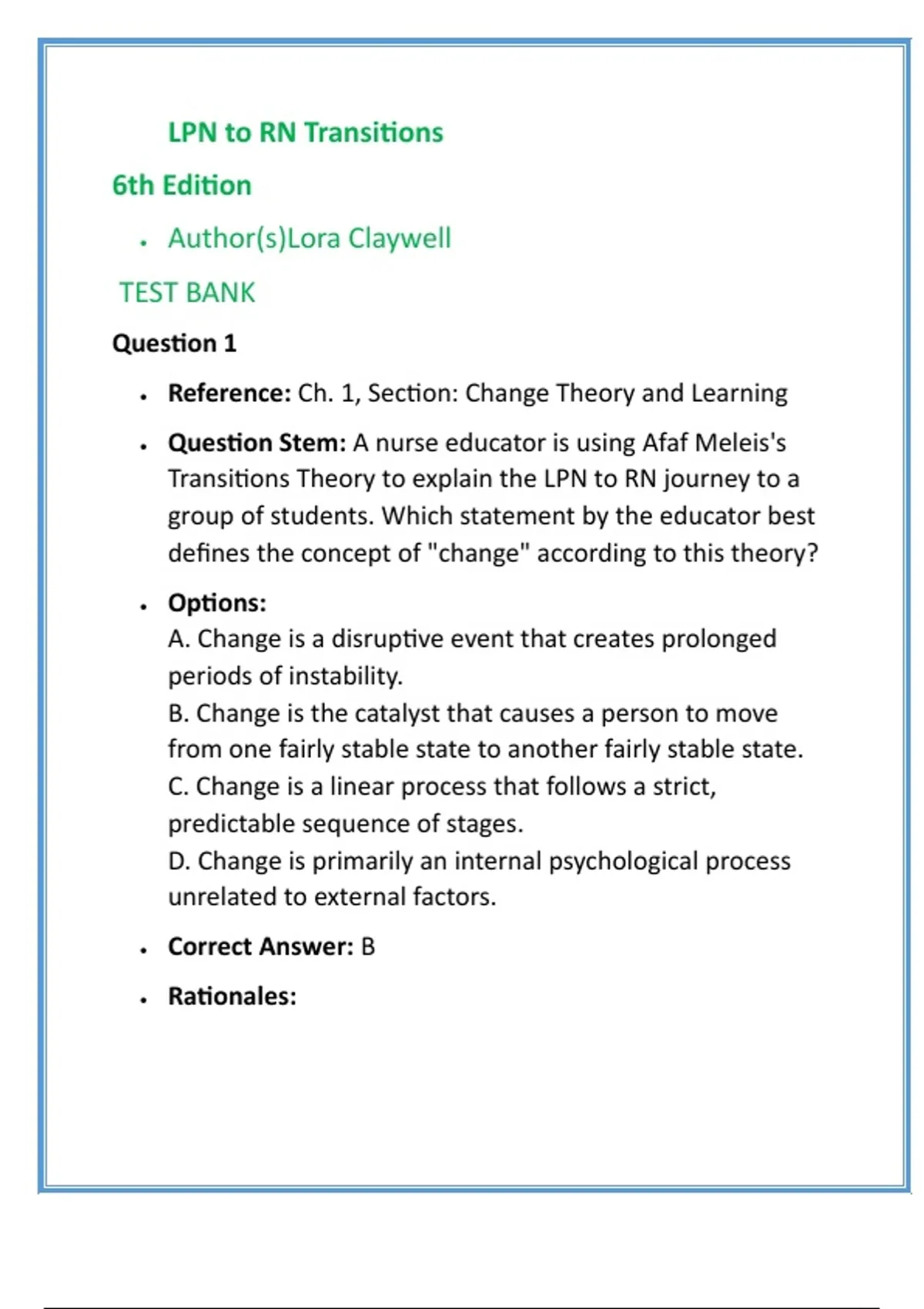 , o Correct: B accurately reflects Meleis's definition of