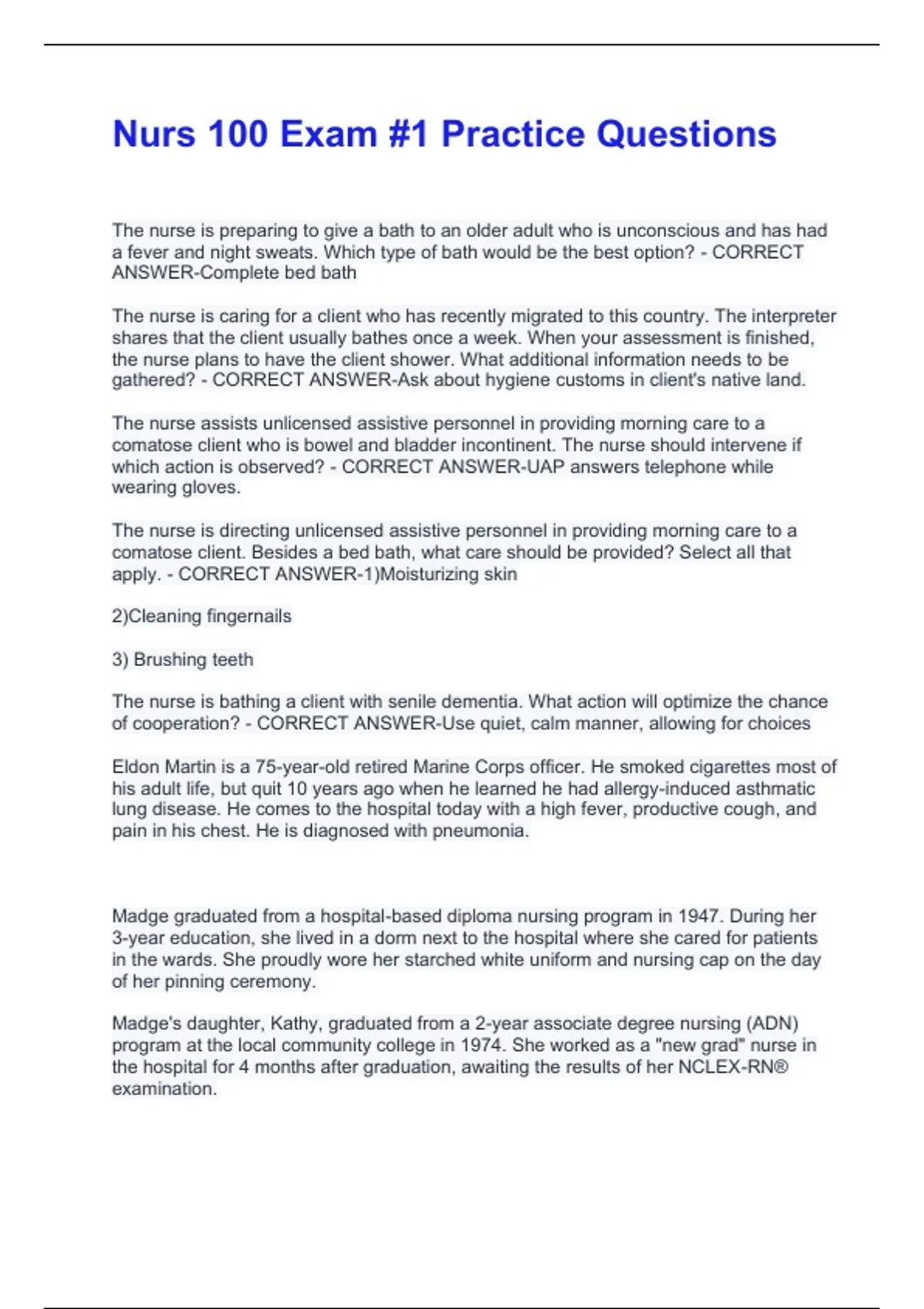 Nurs 100 Exam #1 Practice Questions & Answers Solved 100% Correct!!
