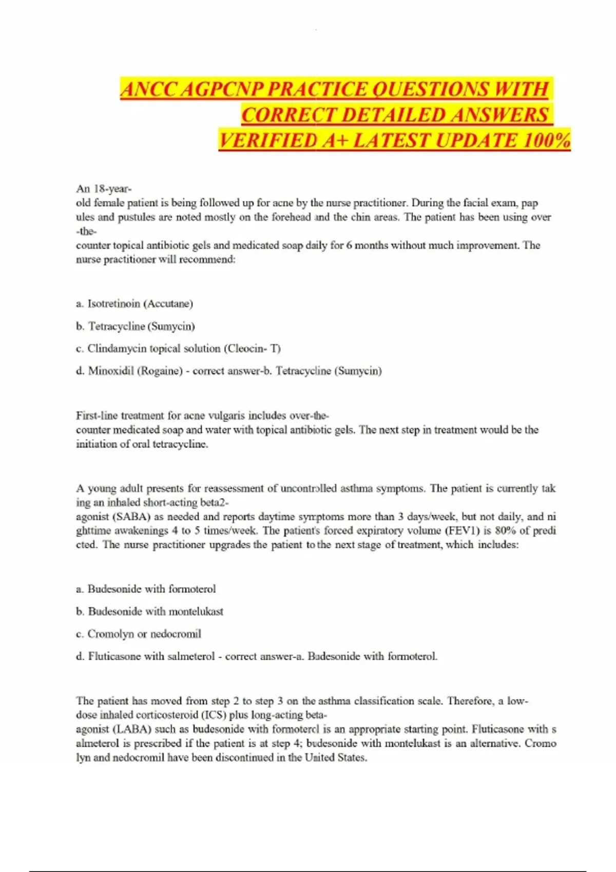 ANCC AGPCNP PRACTICE QUESTIONS WITH CORRECT DETAILED ANSWERS VERIFIED A+ LATEST UPDATE 100% An 18-year- old female patient is being followed up for acne by the nurse practitioner. During the facial exam, pap ules and pustules are noted mostly on the forehead and the chin areas. The patient has been using over -the- counter topical antibiotic gels and medicated soap daily for 6 months without much improvement. The nurse practitioner will recommend: a. Isotretinoin (Accutane) b. Tetracycline (Sumycin) c. Clindamycin topical solution (Cleocin- T) d. Minoxidil (Rogaine) - correct answer-b. Tetracycline (Sumycin) First-line treatment for acne vulgaris includes over-the- counter medicated soap and water with topical antibiotic gels. The next step in treatment would be the initiation of oral tetracycline. A young adult presents for reassessment of uncontrolled asthma symptoms. The patient is currently tak ing an inhaled short-acting beta2- agonist (SABA) as needed and reports daytime symptoms more than 3 days/week, but not daily, and ni ghttime awakenings 4 to 5 times/week. The patient's forced expiratory volume (FEV1) is 80% of predi cted. The nurse practitioner upgrades the patient to the next stage of treatment, which includes: a. Budesonide with formoterol b. Budesonide with montelukast c. Cromolyn or nedocromil d. Fluticasone with salmeterol - correct answer-a. Budesonide with formoterol.
