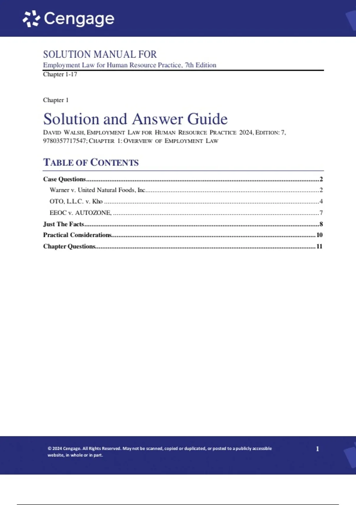 This comprehensive Solution Manual for Employment Law for Human Resource Practice, 7th Edition by David J. Walsh is an essential resource for instructors, students, and HR professionals. It provides detailed, chapter-by-chapter answers to all case questions, "Just the Facts" scenarios, practical considerations, and end-of-chapter questions. Ideal for college courses, HR certification prep, and legal training, this manual offers clear, legally-grounded explanations and practical insights to help users understand and apply employment law principles in real-world HR contexts.