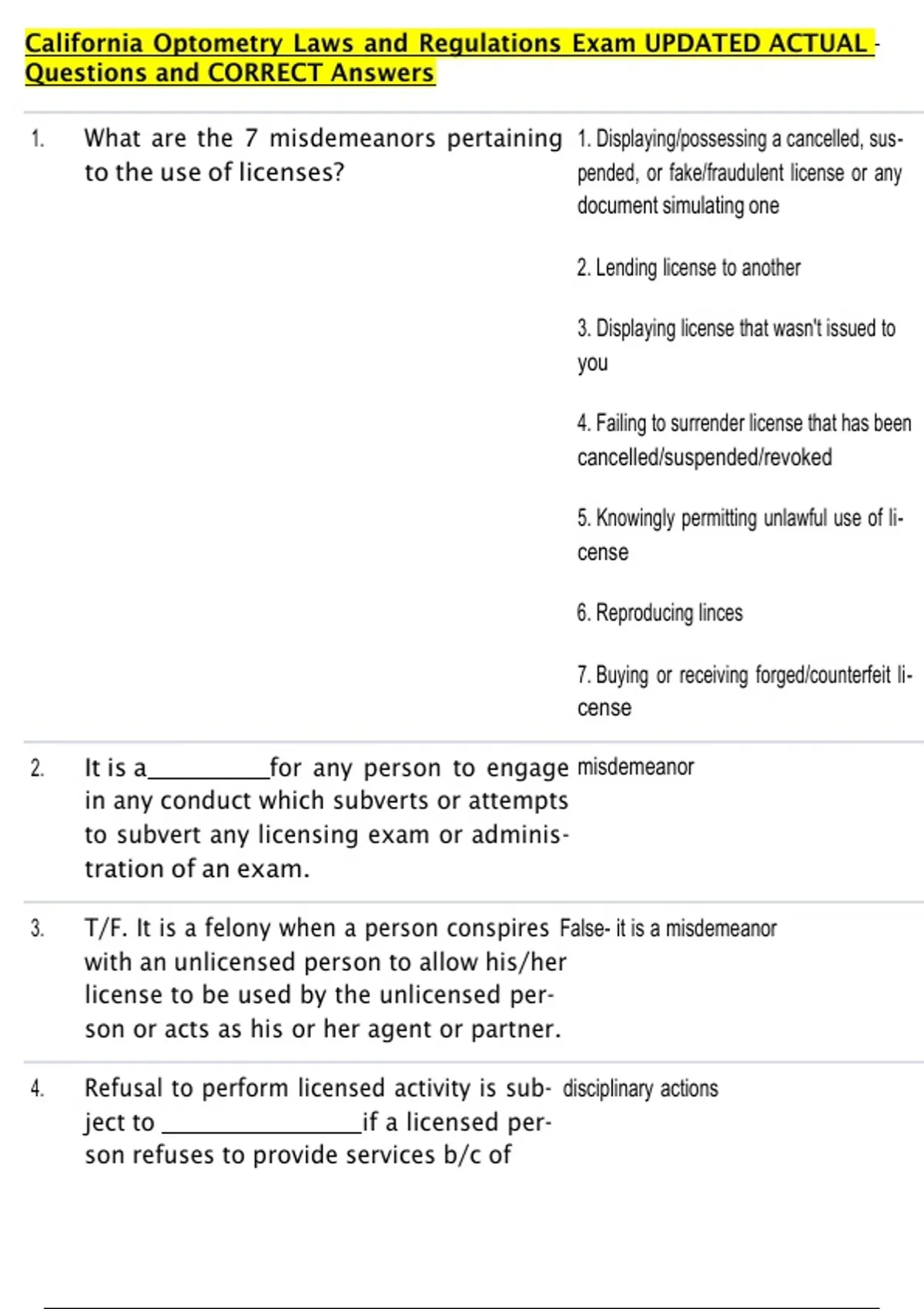 California Optometry Laws and Regulations Exam UPDATED ACTUAL Questions and CORRECT Answers