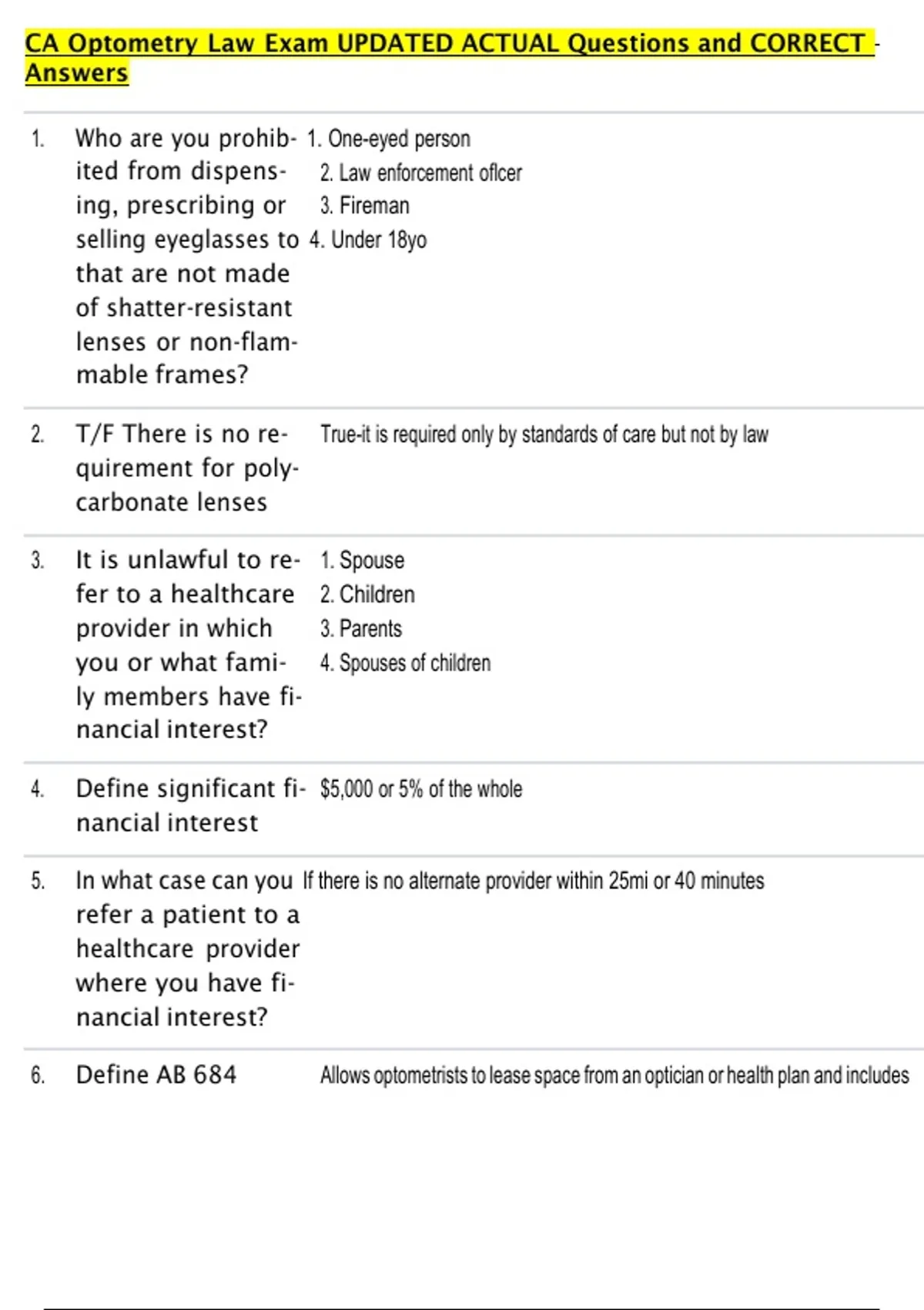CA Optometry Law Exam UPDATED ACTUAL Questions and CORRECT