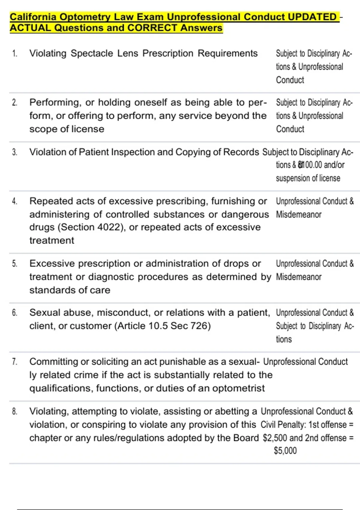 California Optometry Law Exam Unprofessional Conduct UPDATED ACTUAL Questions and CORRECT Answers