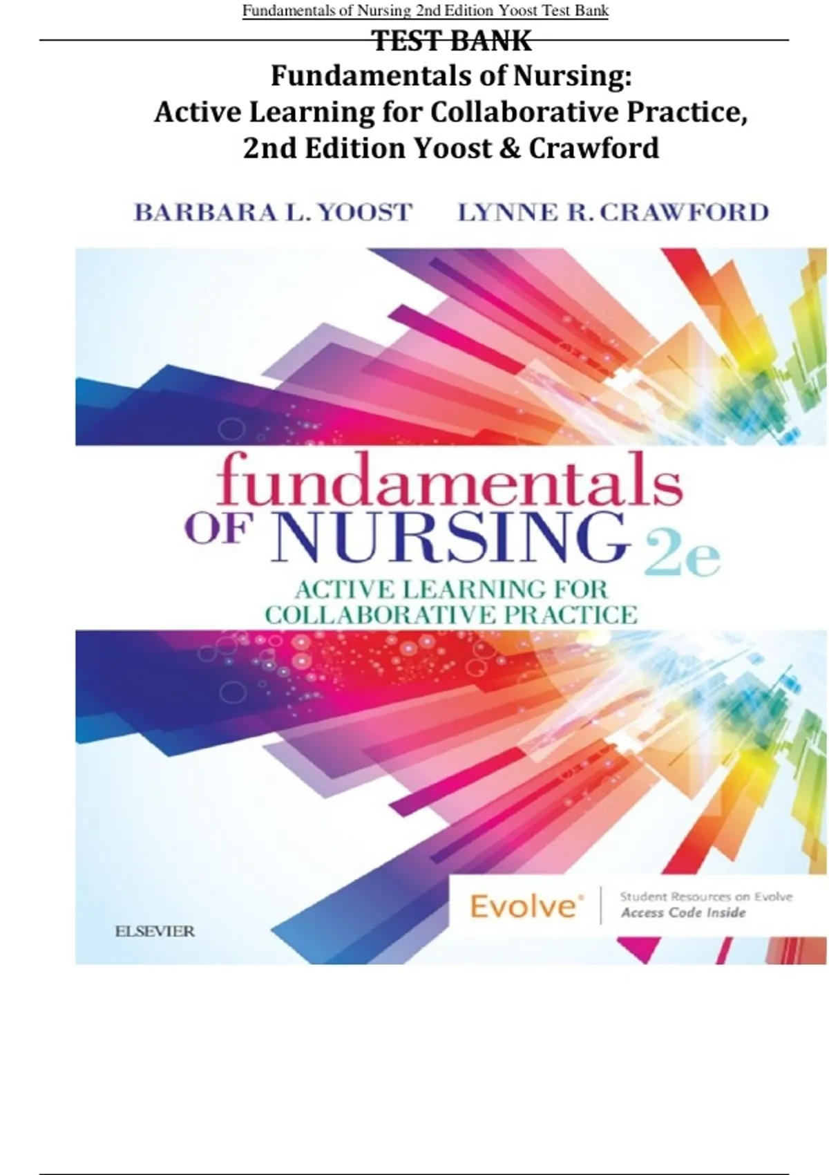 This document provides the full Test Bank for Fundamentals of Nursing: Active Learning for Collaborative Practice (2nd Edition) by Yoost & Crawford. It includes multiple-choice and multiple-response questions for every chapter, complete with correct answers and rationales. Topics covered range from nursing theory, professional practice, values and caring, ethics, and communication to evidence-based practice and patient safety. The test bank aligns with NCLEX-style question formats and supports comprehensive exam preparation for nursing students and instructors.