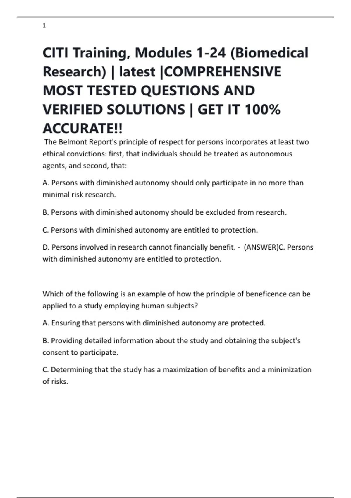 CITI Training, Modules 1-24 (Biomedical Research) | latest |COMPREHENSIVE MOST TESTED QUESTIONS AND VERIFIED SOLUTIONS | GET IT 100% ACCURATE!!