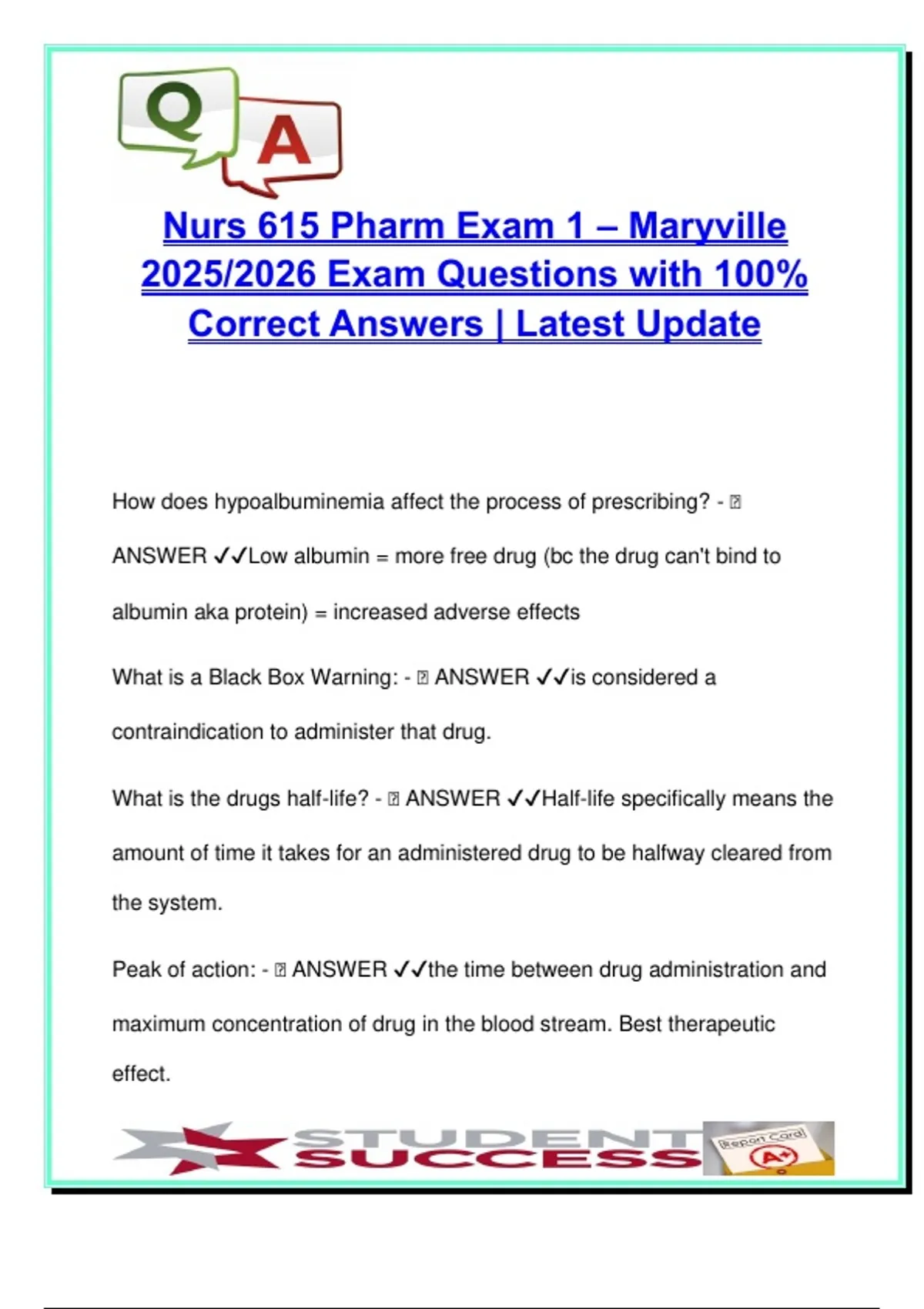 This document contains 65 expertly answered questions for NURS 615 – Advanced Pharmacology at Maryville University, covering foundational concepts in pharmacology necessary for nurse practitioners and healthcare professionals. Key areas include pharmacokinetics and pharmacodynamics, drug metabolism (with emphasis on cytochrome P450 pathways), first-pass metabolism, protein binding, drug half-life, bioavailability, and drug-receptor interactions. It also explains in detail the phases of drug development, WHO prescribing steps, peak/trough principles, blood-brain and placental barriers, and special considerations in pediatrics, geriatrics, pregnancy, and renal/hepatic impairment. The autonomic pharmacology section covers adrenergic and cholinergic systems, beta-blockers, alpha-blockers, clonidine, anticholinergics, and the clinical application of receptor-specific drugs. This study material is especially valuable for students enrolled in: Family Nurse Practitioner (FNP) Adult-Gerontology NP (AGNP) Doctor of Nursing Practice (DNP) PharmD and PA (Physician Assistant) programs It is also suitable for medical students reviewing pharmacological foundations and prescribing principles. Designed in a clear Q&A format, the guide aids in mastering high-yield concepts for exam prep, clinical application, and certification review. Keywords: NURS 615, pharmacokinetics, pharmacodynamics, CYP450, first-pass effect, prescribing principles, drug metabolism, protein binding, half-life, black box warning, WHO prescribing steps, pediatric pharmacology, geriatric dosing, beta blockers, alpha blockers, clonidine, autonomic pharmacology, cholinergic blockers, St. John's Wort interactions