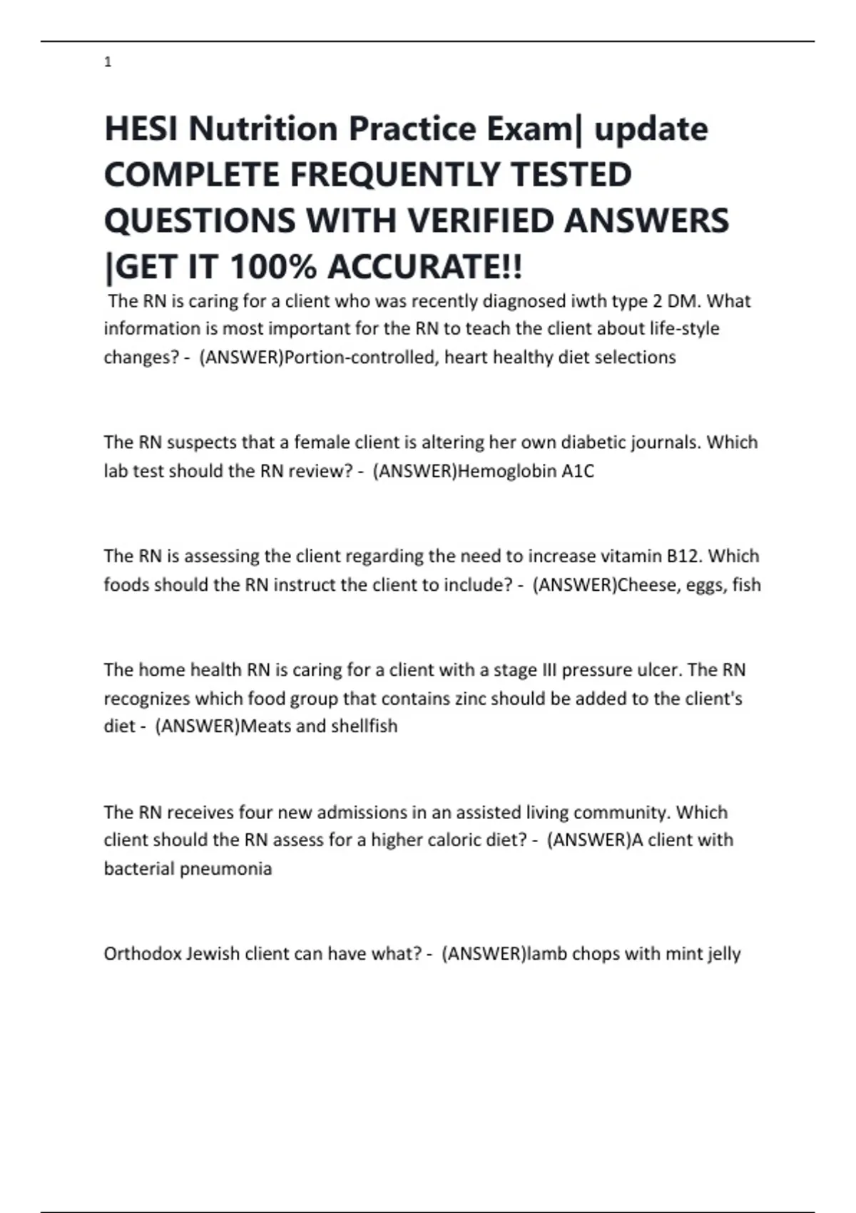 HESI Nutrition Practice Exam| update COMPLETE FREQUENTLY TESTED QUESTIONS WITH VERIFIED ANSWERS |GET IT 100% ACCURATE!!