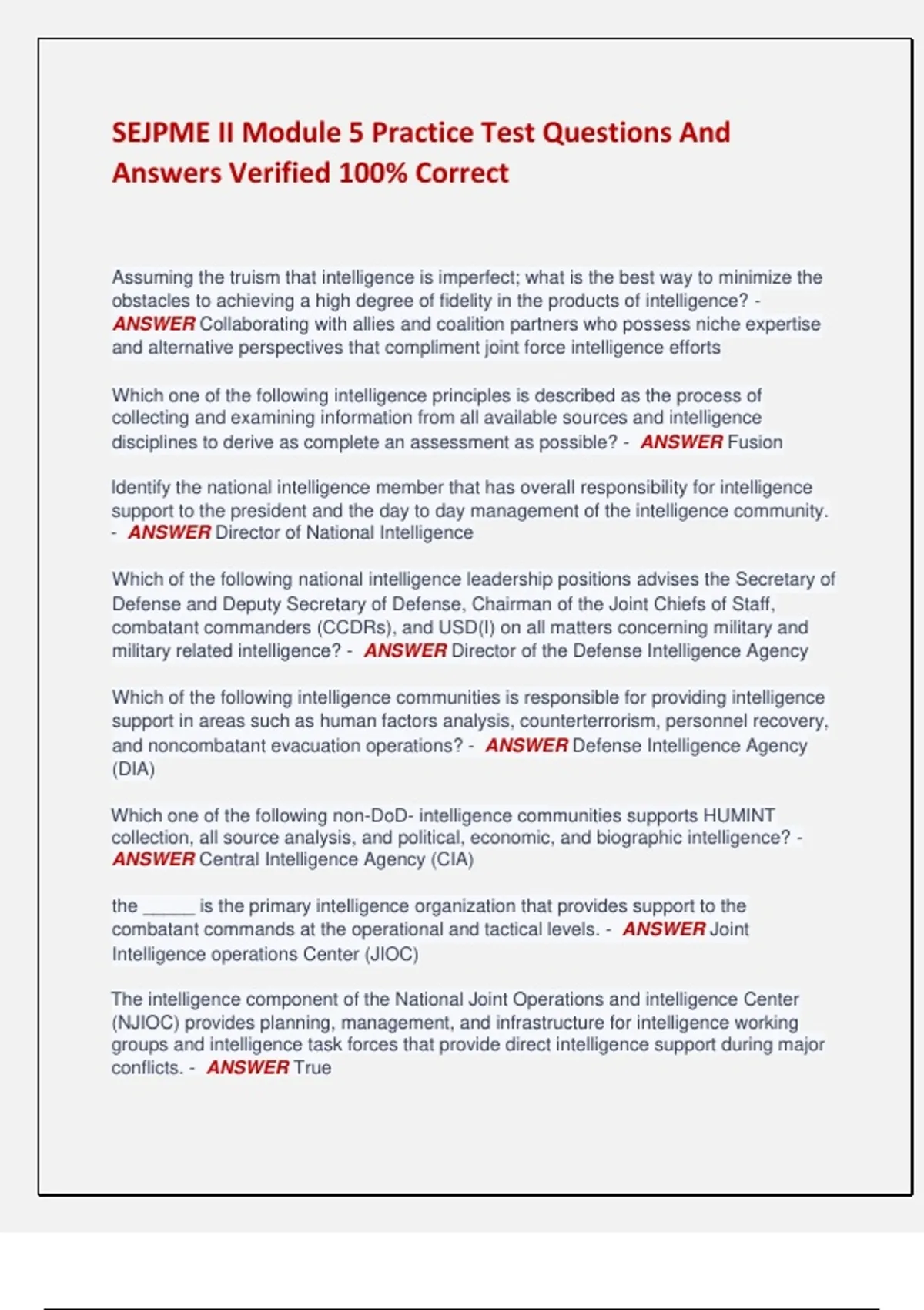 SEJPME II Module 5 Practice Test Questions And Answers Verified 100% Correct Assuming the truism that intelligence is imperfect; what is the best way to minimize the obstacles to achieving a high degree of fidelity in the products of intelligence? - ANSWER Collaborating with allies and coalition partners who possess niche expertise and alternative perspectives that compliment joint force intelligence efforts Which one of the following intelligence principles is described as the process of collecting and examining information from all available sources and intelligence disciplines to derive as complete an assessment as possible? - ANSWER Fusion Identify the national intelligence member that has overall responsibility for intelligence support to the president and the day to day management of the intelligence community. - ANSWER Director of National Intelligence Which of the following national intelligence leadership positions advises the Secretary of Defense and Deputy Secretary of Defense, Chairman of the Joint Chiefs of Staff, combatant commanders (CCDRs), and USD(I) on all matters concerning military and military related intelligence? - ANSWER Director of the Defense Intelligence Agency Which of the following intelligence communities is responsible for providing intelligence support in areas such as human factors analysis, counterterrorism, personnel recovery, and noncombatant evacuation operations? - ANSWER Defense Intelligence Agency (DIA) Which one of the following non-DoD- intelligence communities supports HUMINT collection, all source analysis, and political, economic, and biographic intelligence? - ANSWER Central Intelligence Agency (CIA) the _____ is the primary intelligence organization that provides support to the combatant commands at the operational and tactical levels. - ANSWER Joint Intelligence operations Center (JIOC) The intelligence component of the National Joint Operations and intelligence Center (NJIOC) provides planning, management, and infrastructure for intelligence working groups and intelligence task forces that provide direct intelligence support during major conflicts. - ANSWER True Joint intelligence planning supports joint operation planning and results in the production of what three products? - ANSWER Dynamic Threat Assessment Annex B: Intelligence National intelligence support plan Which of the following roles must be well versed with timelines required to complete a required product and able to obtain the aid of external resources in acquiring needed intelligence? - ANSWER ***NOT*** Intelligence Analysts Which of the following are tasks that the J2 performs? (Select all that apply) - ANSWER ***NOT*** -Analyze the Adversary and other relevant aspects of the operational environment Ensure that critical intelligence is disseminated appropriately in a timely manner to the joint force commanders, Staff, and components