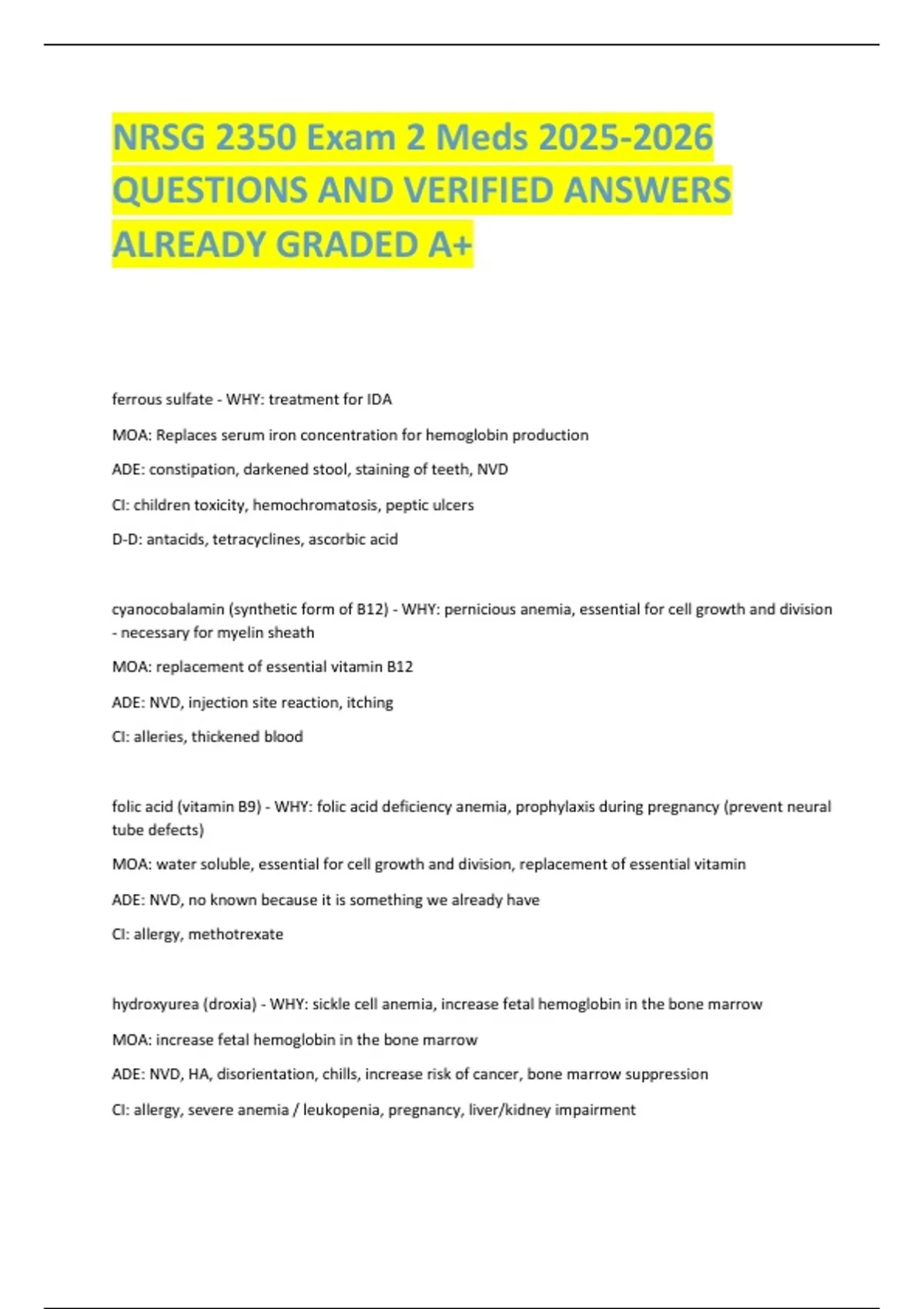 NRSG 2350 Exam 2 Meds QUESTIONS AND VERIFIED ANSWERS ALREADY GRADED A+
