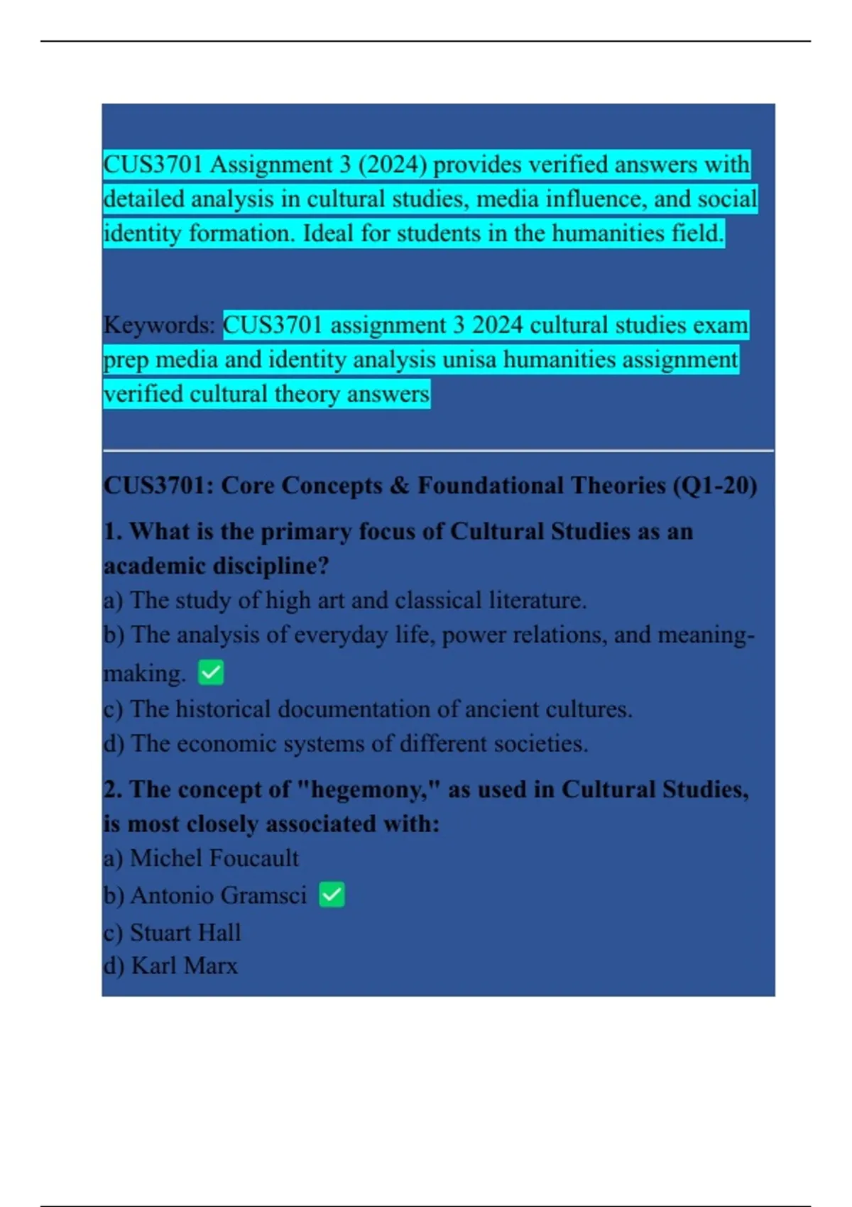 Keywords: CUS3701 assignment 3 2024 cultural studies exam