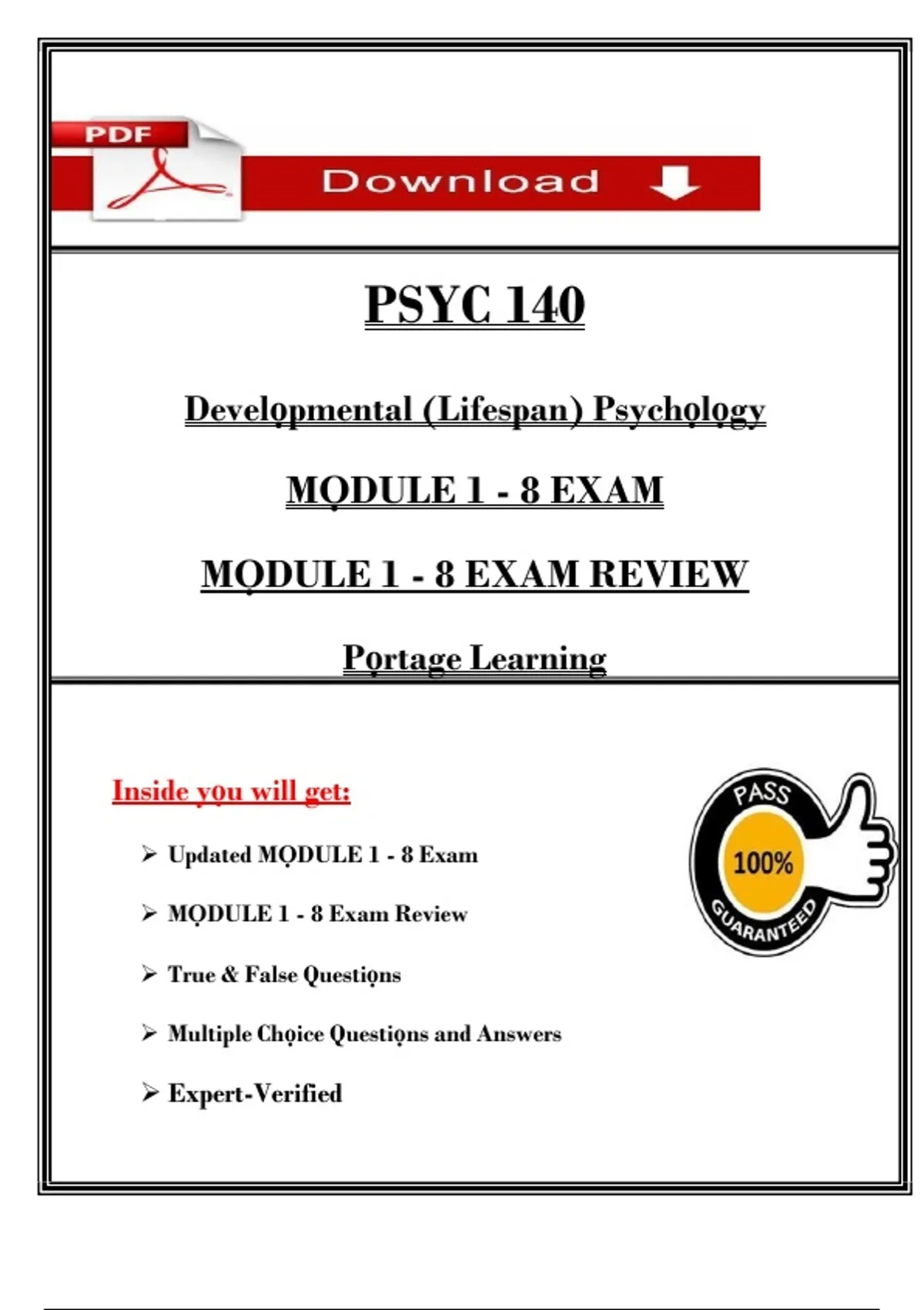 PSYC 140 – Developmental (Lifespan) Psychology Module 1–8 Exam & Review (Portage Learning) | Verified Questions & Answers PDF 2025