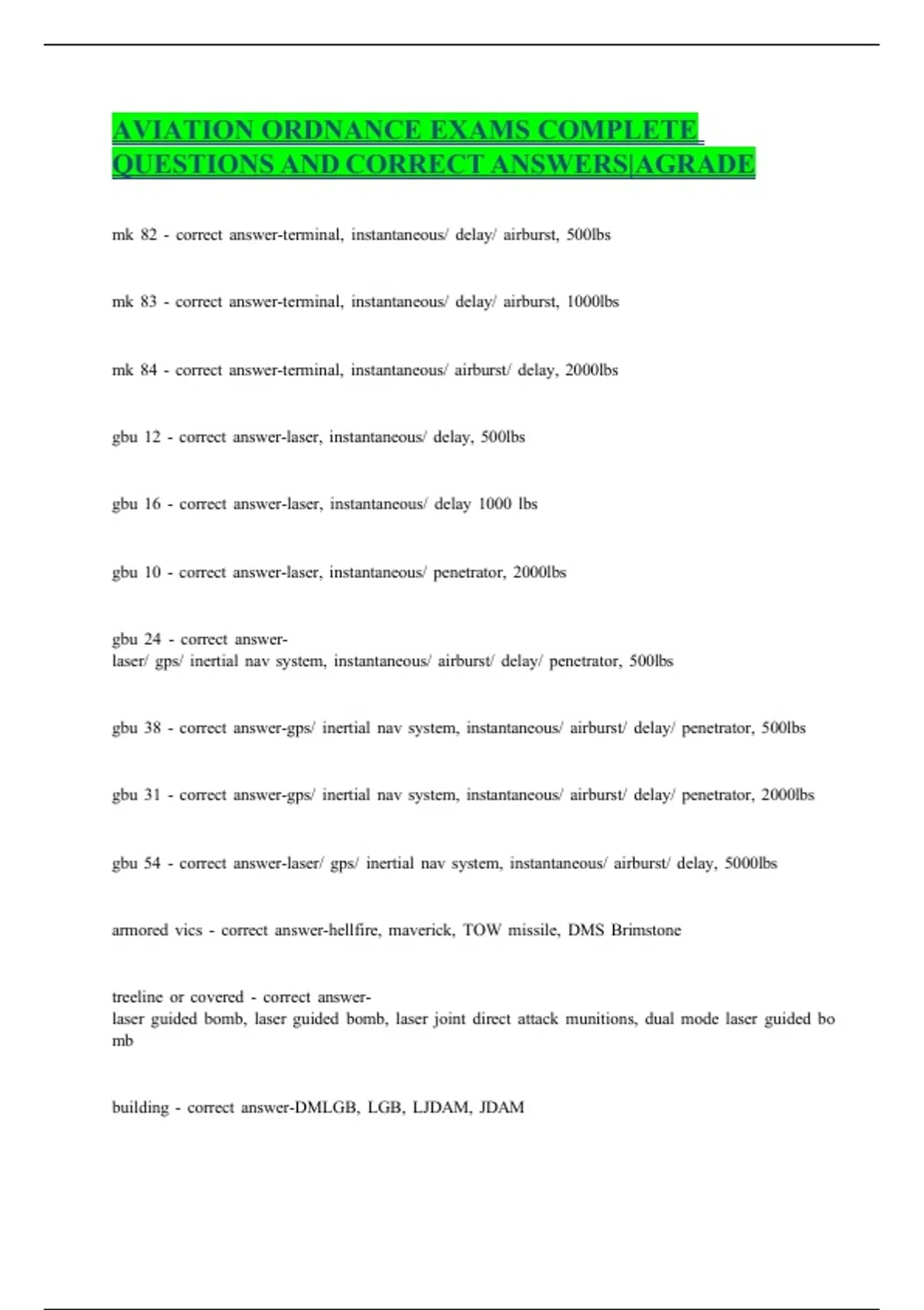 This comprehensive study guide is designed for students and professionals preparing for Aviation Ordnance exams. It includes a complete set of exam-style questions with verified correct answers, covering key topics such as weapons systems, safety protocols, maintenance procedures, and ordnance handling. Ideal for Navy personnel, aviation technicians, and military exam candidates, this resource ensures thorough preparation and confidence in passing with top grades.