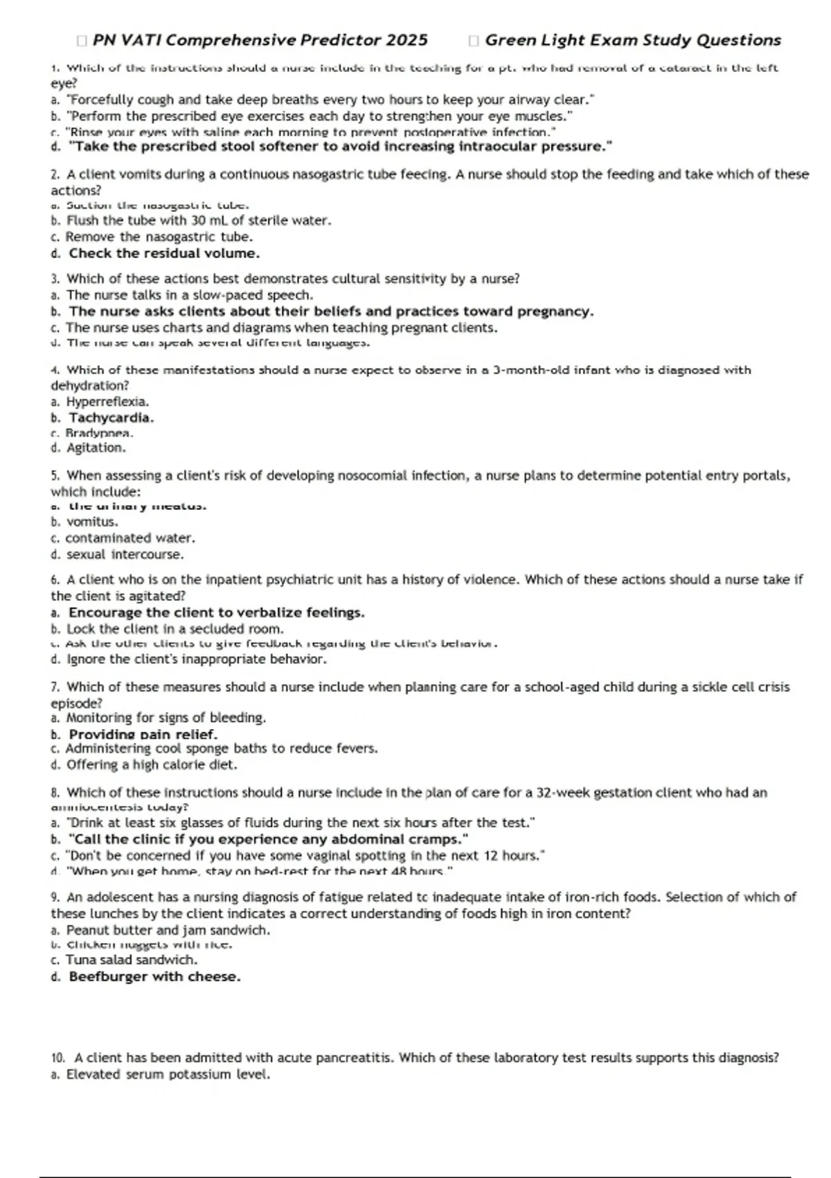 1. Which of the instructions should a nurse include in the teaching for a pt. who had removal of a cataract in the left eye? a. "Forcefully cough and take deep breaths every two hours to keep your airway clear." b. "Perform the prescribed eye exercises each day to strengthen your eye muscles." c. "Rinse your eyes with saline each morning to prevent postoperative infection." d. "Take the prescribed stool softener to avoid increasing intraocular pressure." 2. A client vomits during a continuous nasogastric tube feeding. A nurse should stop the feeding and take which of these actions? a. Suction the nasogastric tube. b. Flush the tube with 30 mL of sterile water. c. Remove the nasogastric tube. d. Check the residual volume. 3. Which of these actions best demonstrates cultural sensitivity by a nurse? a. The nurse talks in a slow-paced speech. b. The nurse asks clients about their beliefs and practices toward pregnancy. c. The nurse uses charts and diagrams when teaching pregnant clients. d. The nurse can speak several different languages. 4. Which of these manifestations should a nurse expect to observe in a 3-month-old infant who is diagnosed with dehydration? a. Hyperreflexia. b. Tachycardia. c. Bradypnea. d. Agitation. 5. When assessing a client's risk of developing nosocomial infection, a nurse plans to determine potential entry portals, which include: a. the urinary meatus. b. vomitus. c. contaminated water. d. sexual intercourse. 6. A client who is on the inpatient psychiatric unit has a history of violence. Which of these actions should a nurse take if the client is agitated? a. Encourage the client to verbalize feelings. b. Lock the client in a secluded room. c. Ask the other clients to give feedback regarding the client's behavior. d. Ignore the client's inappropriate behavior. 7. Which of these measures should a nurse include when planning care for a school-aged child during a sickle cell crisis episode? a. Monitoring for signs of bleeding. b. Providing pain relief. c. Administering cool sponge baths to reduce fevers. d. Offering a high calorie diet. 8. Which of these instructions should a nurse include in the plan of care for a 32-week gestation client who had an amniocentesis today? a. "Drink at least six glasses of fluids during the next six hours after the test." b. "Call the clinic if you experience any abdominal cramps." c. "Don't be concerned if you have some vaginal spotting in the next 12 hours." d. "When you get home, stay on bed-rest for the next 48 hours." 9. An adolescent has a nursing diagnosis of fatigue related to inadequate intake of iron-rich foods. Selection of which of these lunches by the client indicates a correct understanding of foods high in iron content? a. Peanut butter and jam sandwich. b. Chicken nuggets with rice. c. Tuna salad sandwich. d. Beefburger with cheese. 10. A client has been admitted with acute pancreatitis. Which of these laboratory test results supports this diagnosis? a. Elevated serum potassium level. b. Elevated serum amylase level. c. Elevated serum sodium level. d. Elevated serum creatinine level.