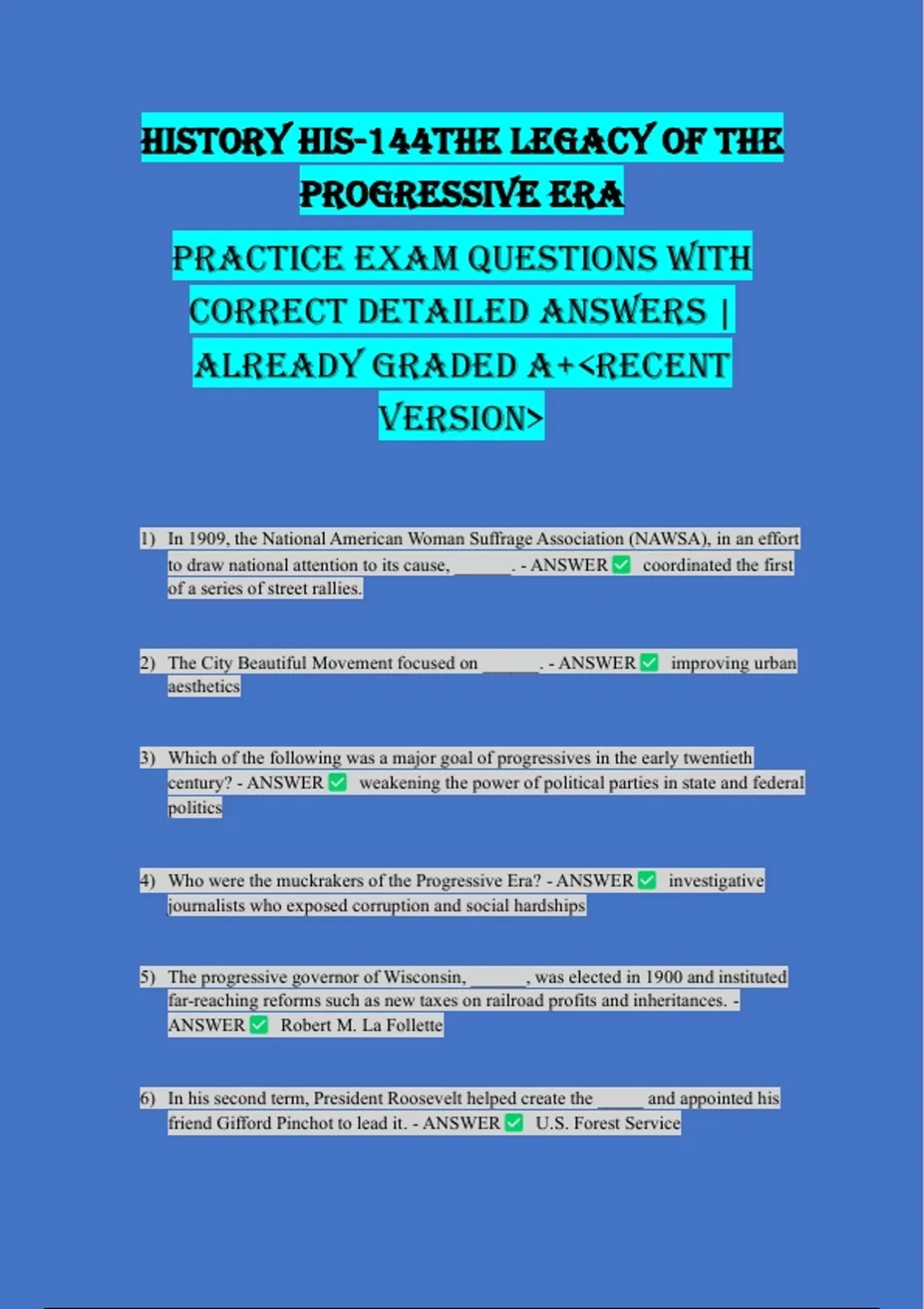HISTORY HIS-144THE LEGACY OF THE PROGRESSIVE ERA PRACTICE EXAM QUESTIONS WITH CORRECT DETAILED ANSWERS | ALREADY GRADED A+RECENT VERSION