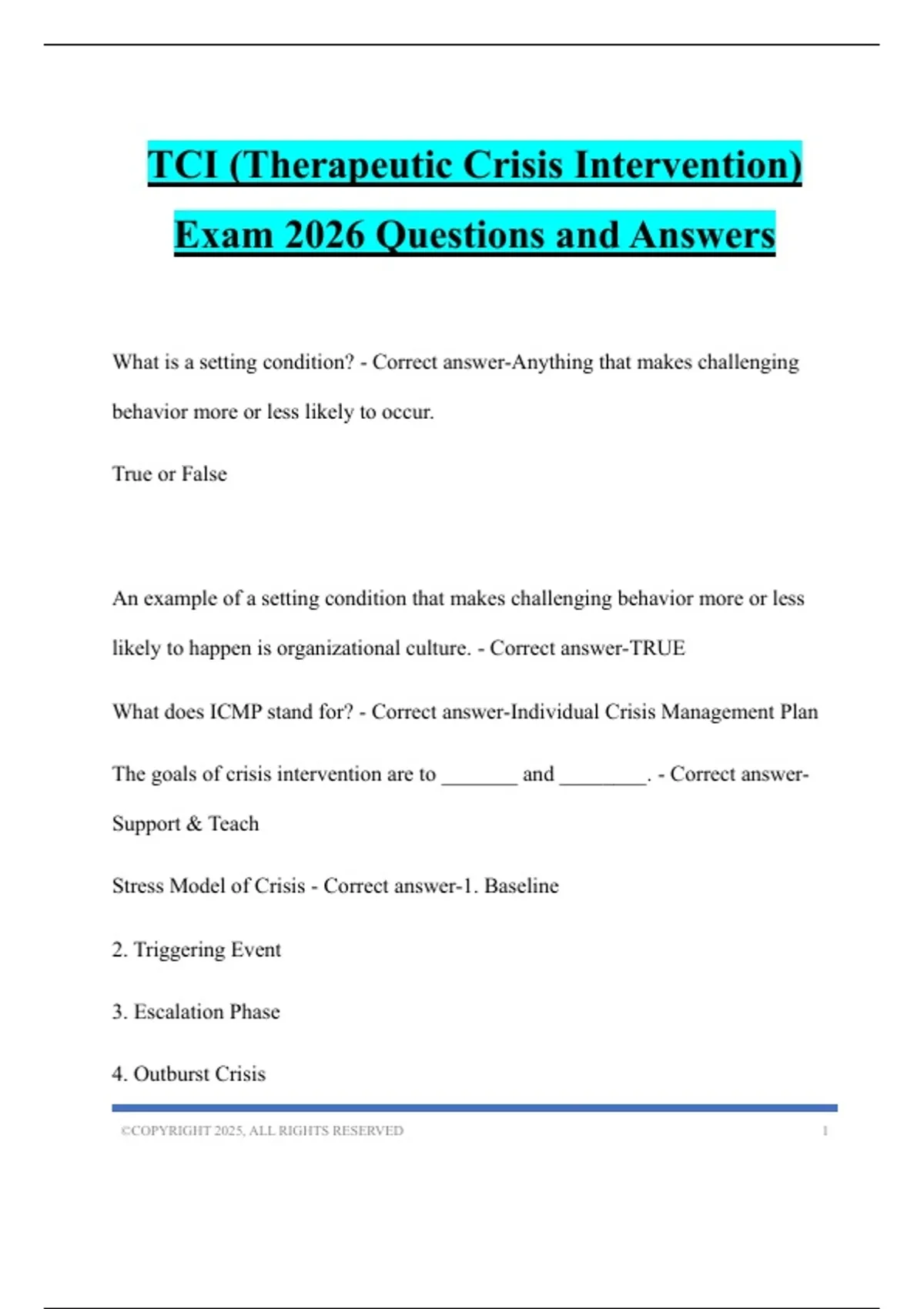 TCI (Therapeutic Crisis Intervention) Exam 2026 Questions and Answers