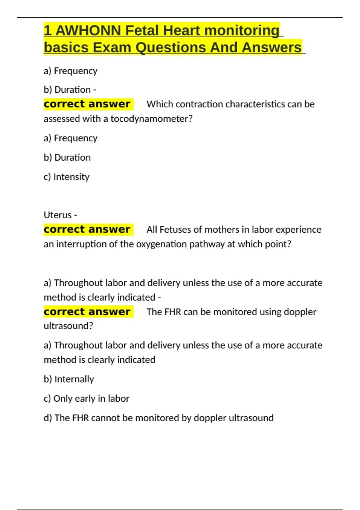 1 AWHONN Fetal Heart monitoring basics Exam Questions And A