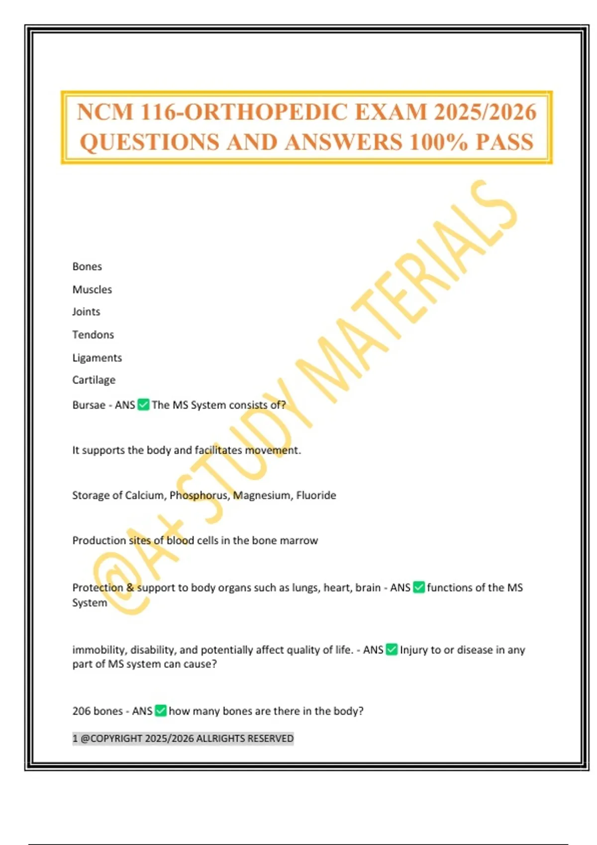 NCM 116-ORTHOPEDIC EXAM 2025/2026 QUESTIONS AND ANSWERS 100% PASS