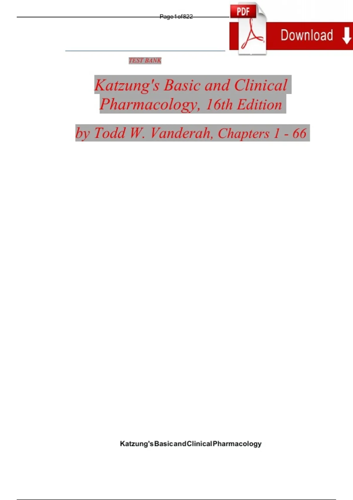 This comprehensive test bank includes all 66 chapters from Katzung’s Basic and Clinical Pharmacology (16th Edition) by Todd W. Vanderah. It provides multiple-choice questions with detailed answers and rationales covering the full spectrum of pharmacological principles, including drug mechanisms, therapeutic uses, adverse effects, and clinical applications. Topics span autonomic pharmacology, cardiovascular drugs, antimicrobial therapy, central nervous system agents, and toxicology. Perfect for medical, pharmacy, and nursing students preparing for exams or board reviews.