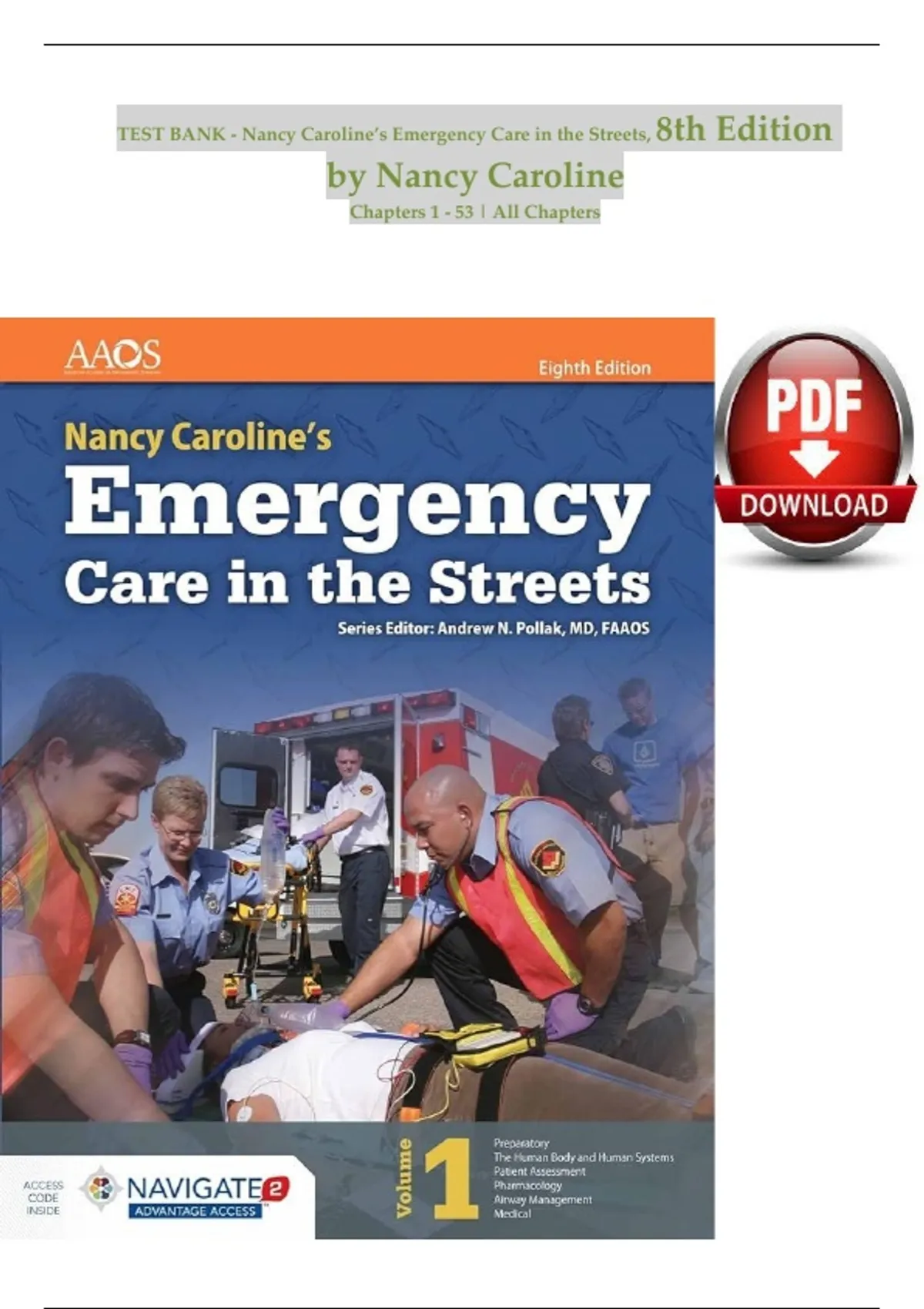 This comprehensive test bank covers all 53 chapters from Nancy Caroline’s Emergency Care in the Streets (8th Edition). It features multiple-choice questions with detailed answers and explanations designed to reinforce key paramedic knowledge areas, including patient assessment, trauma management, medical emergencies, pharmacology, airway care, pediatrics, obstetrics, and EMS operations. An essential study resource for paramedic students, instructors, and professionals preparing for exams or certification reviews.