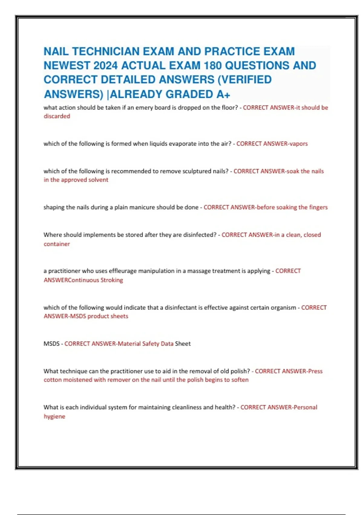 NAIL TECHNICIAN EXAM AND PRACTICE EXAM NEWEST 2024 ACTUAL EXAM 180 QUESTIONS AND CORRECT DETAILED ANSWERS (VERIFIED ANSWERS) |ALREADY GRADED A+ what action should be taken if an emery board is dropped on the floor? - CORRECT ANSWER-it should be discarded which of the following is formed when liquids evaporate into the air? - CORRECT ANSWER-vapors which of the following is recommended to remove sculptured nails? - CORRECT ANSWER-soak the nails in the approved solvent shaping the nails during a plain manicure should be done - CORRECT ANSWER-before soaking the fingers Where should implements be stored after they are disinfected? - CORRECT ANSWER-in a clean, closed container a practitioner who uses effleurage manipulation in a massage treatment is applying - CORRECT ANSWERContinuous Stroking which of the following would indicate that a disinfectant is effective against certain organism - CORRECT ANSWER-MSDS product sheets MSDS - CORRECT ANSWER-Material Safety Data Sheet What technique can the practitioner use to aid in the removal of old polish? - CORRECT ANSWER-Press cotton moistened with remover on the nail until the polish begins to soften What is each individual system for maintaining cleanliness and health? - CORRECT ANSWER-Personal hygiene the PRIMARY function of an MSDS is to provide the pracitioner with - CORRECT ANSWER-Knowledge of first aid procedures When making a pedicure appointment, what should clients be told NOT to do the day of the service - CORRECT ANSWER-shave their legs What term describes injury and bleeding in the nail bed? - CORRECT ANSWER-Bruised nail Sterilization destroys - CORRECT ANSWER-both harmful and beneficial bacterial What is the Main purpose of a manicure? - CORRECT ANSWER-Improve the appearance of the hands and nails The infection control procedures used to protect the client and the practitioner are referred to as - CORRECT ANSWER-A germ free environment When performing a visual analysis of the hands, what BEST indicates that an infection is present? - CORRECT ANSWER-swelling around the cuticle area Which of the following should be considered BEFORE a client's nails are shaped? - CORRECT ANSWERlength and shape of the hands and fingers What is used to bond a nail tip to the natural nail? - CORRECT ANSWER-adhesive