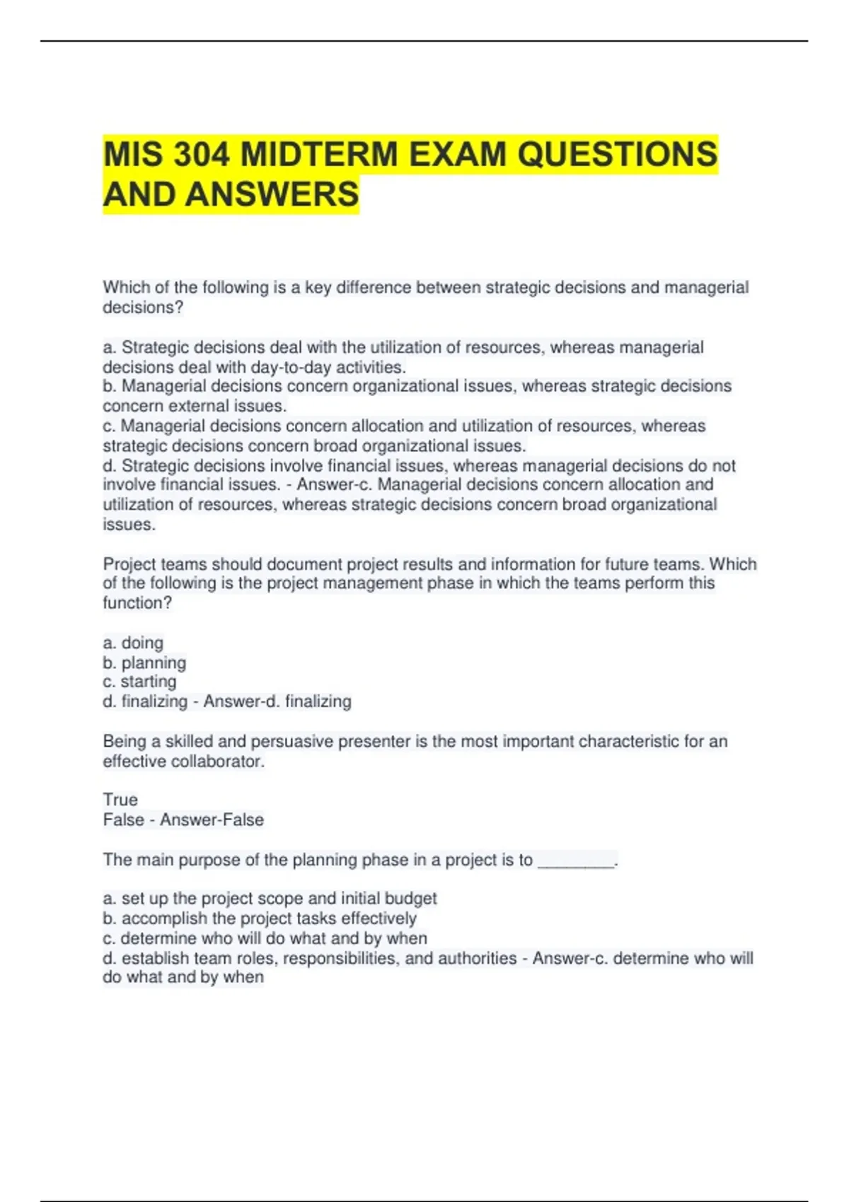 MIS 304 MIDTERM EXAM QUESTIONS AND ANSWERS