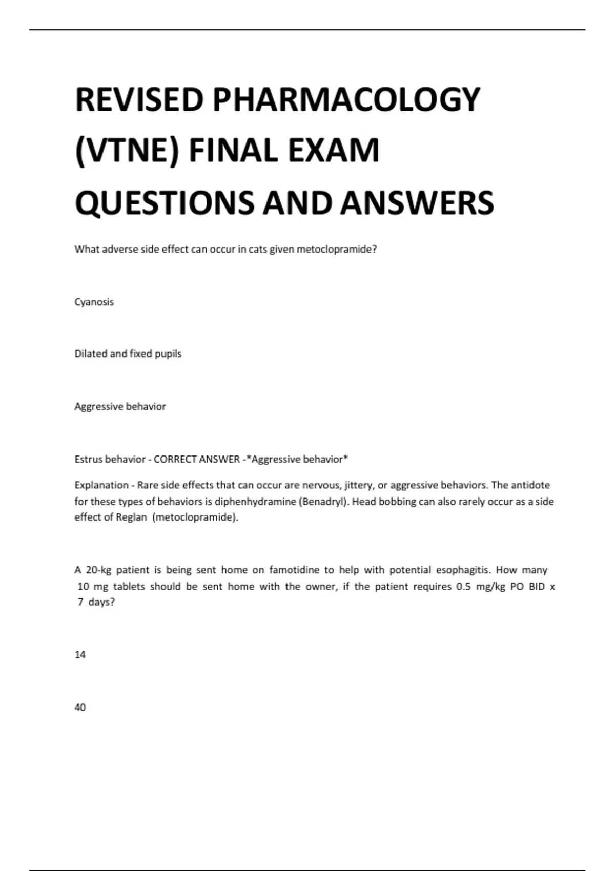 Ace your VTNE Pharmacology Final Exam 2025 with this revised and verified question-and-answer test bank, designed specifically for veterinary technician students preparing for the Veterinary Technician National Exam in the United States. This resource includes real exam-style questions, accurate answers, and comprehensive rationales covering drug classifications, dosage calculations, pharmacokinetics, and safe medication practices for animals. Perfect for last-minute review or in-depth study, this test bank mirrors the actual VTNE format to boost confidence and ensure exam success. Download now to study smarter and earn A+ results in VTNE Pharmacology!