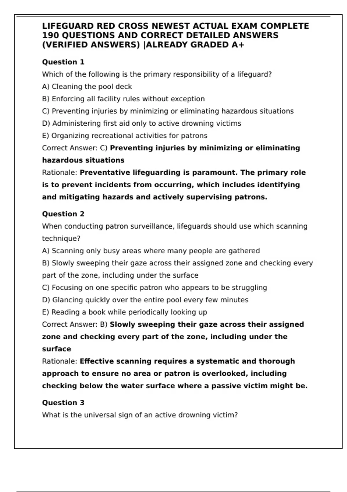 This document provides the newest and most complete version of the American Red Cross Lifeguard Certification Exam, featuring 190 verified multiple-choice and scenario-based questions with detailed correct answers and explanations (graded A+). It covers all key topics required for lifeguard certification, including water rescue techniques, CPR/AED, first aid, spinal injury management, emergency action plans, surveillance and prevention, and legal responsibilities. Perfect for students preparing for Red Cross Lifeguarding, Shallow Water, and Waterfront certifications, this guide ensures comprehensive knowledge and readiness for the official exam.