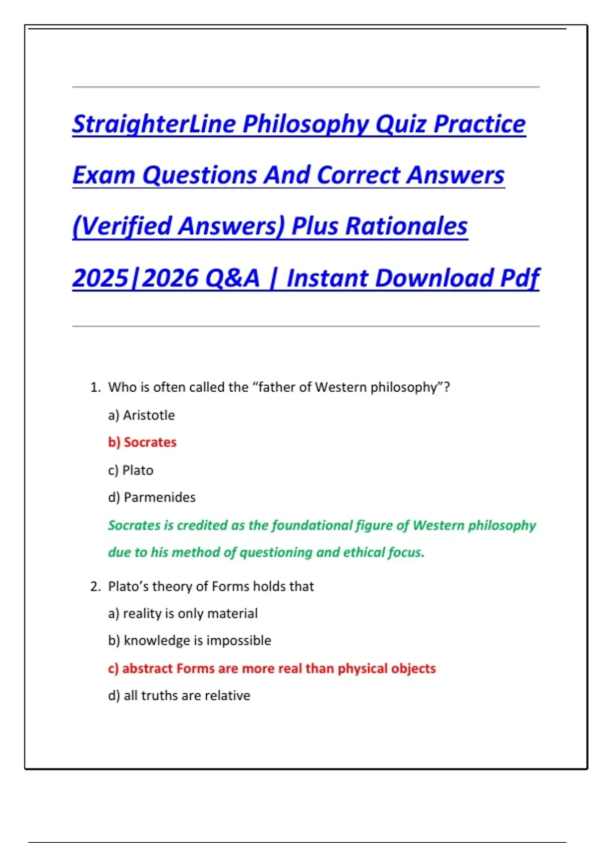 StraighterLine Philosophy Quiz Practice Exam Questions And Correct Answers (Verified Answers) Plus Rationales 2025|2026 Q&A | Instant Download Pdf