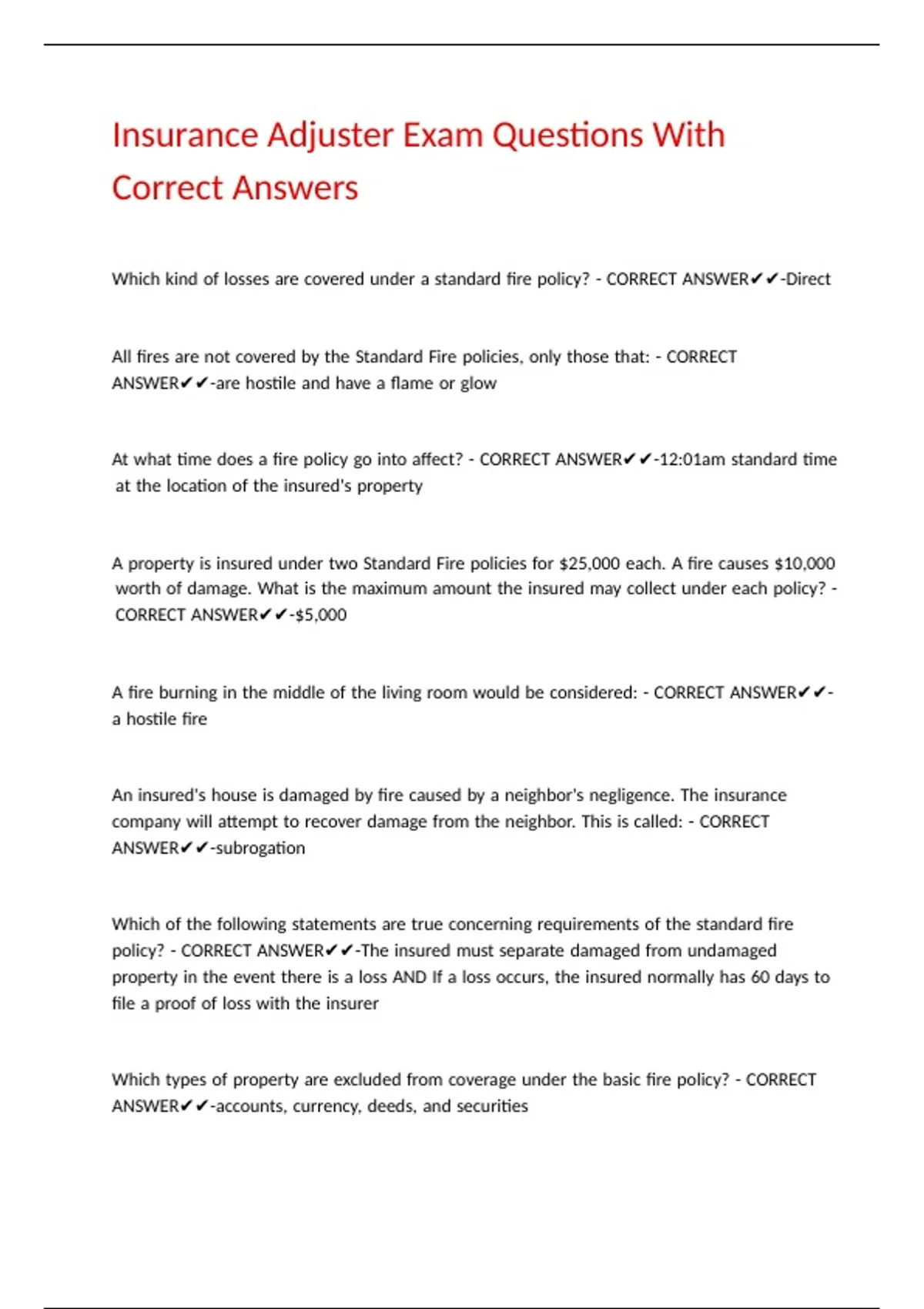 Insurance Adjuster Exam Questions With Correct Answers