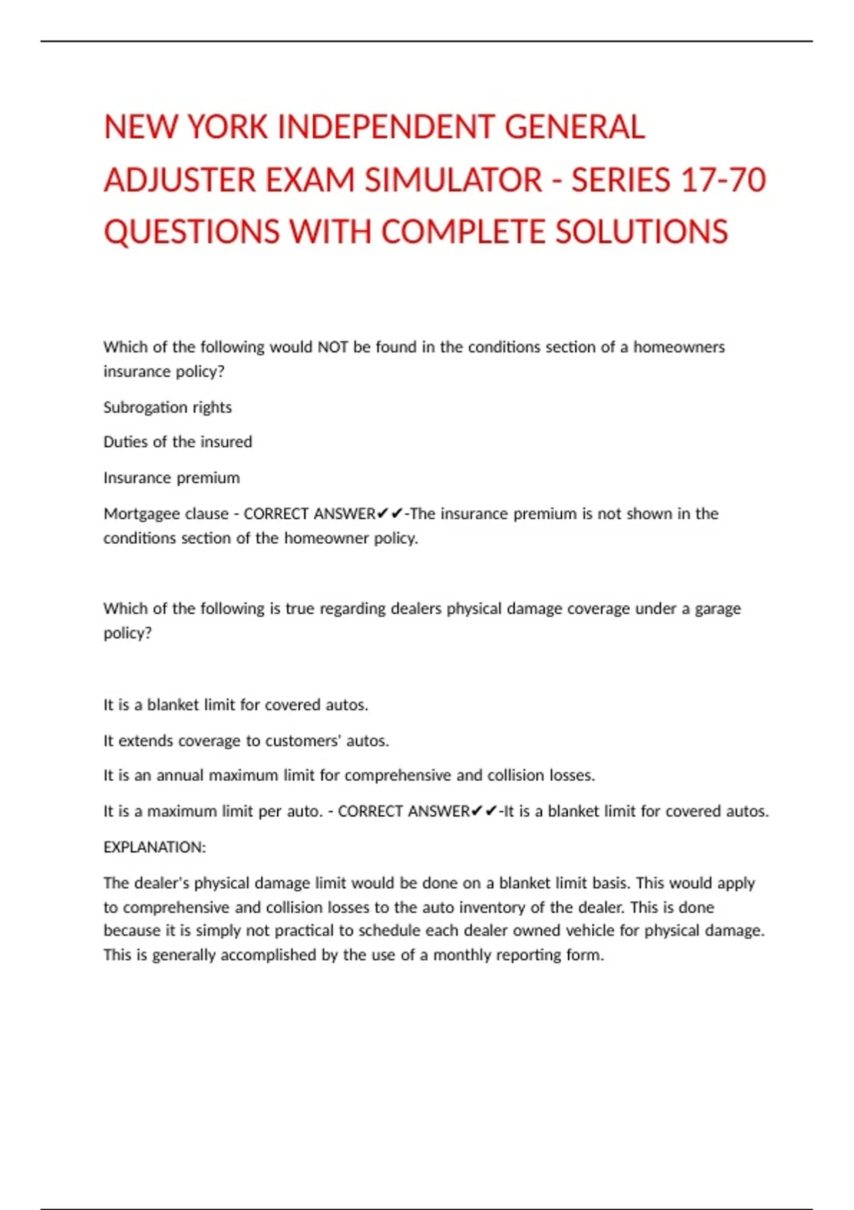 NEW YORK INDEPENDENT GENERAL ADJUSTER EXAM SIMULATOR - SERIES 17-70 QUESTIONS WITH COMPLETE SOLUTIONS