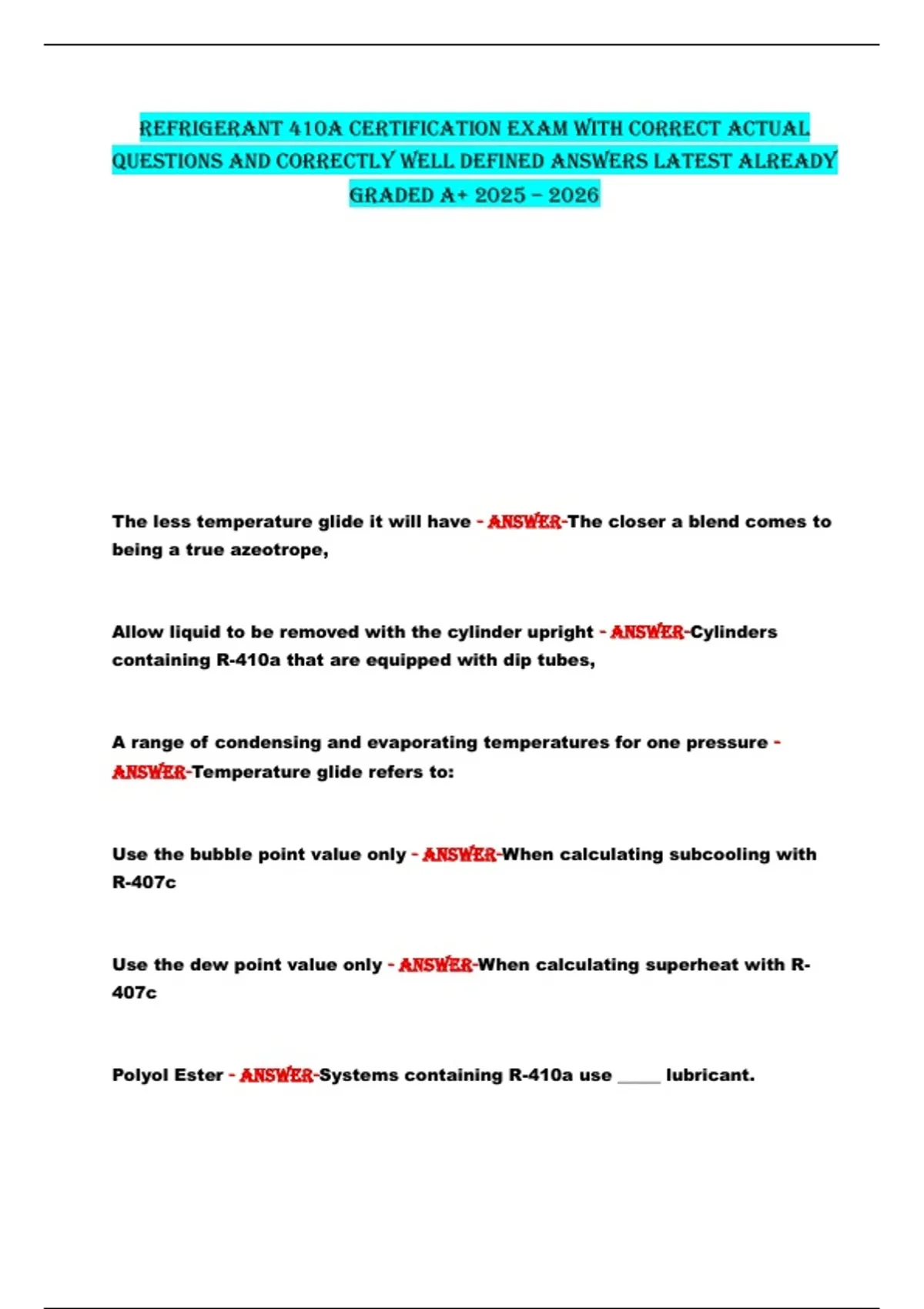 REFRIGERANT 410A CERTIFICATION EXAM WITH CORRECT ACTUAL