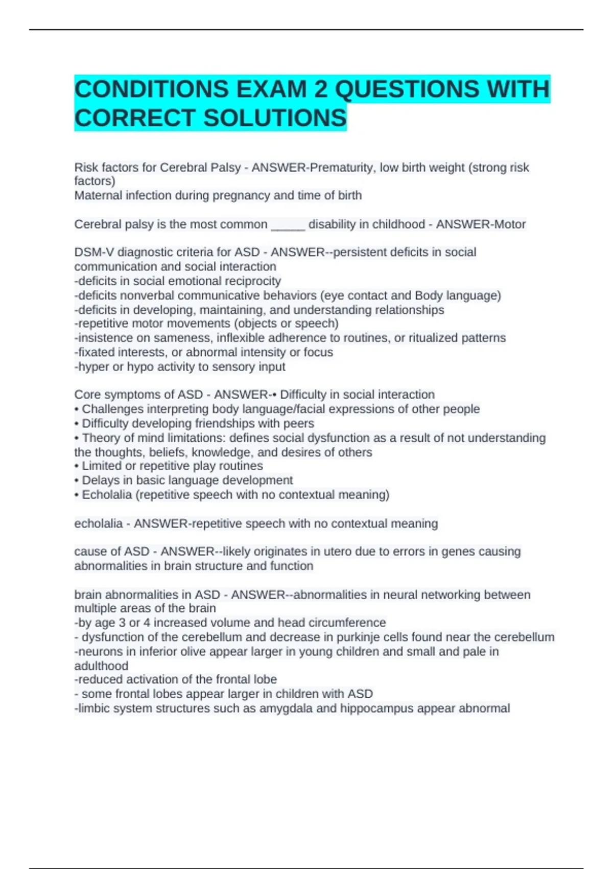 CONDITIONS EXAM 2 QUESTIONS WITH CORRECT SOLUTIONSCONDITIONS EXAM 2 QUESTIONS WITH CORRECT SOLUTIONSCONDITIONS EXAM 2 QUESTIONS WITH CORRECT SOLUTIONS Risk factors for Cerebral Palsy - ANSWER-Prematurity, low birth weight (strong risk factors) Maternal infection during pregnancy and time of birth Cerebral palsy is the most common _____ disability in childhood - ANSWER-Motor DSM-V diagnostic criteria for ASD - ANSWER--persistent deficits in social communication and social interaction