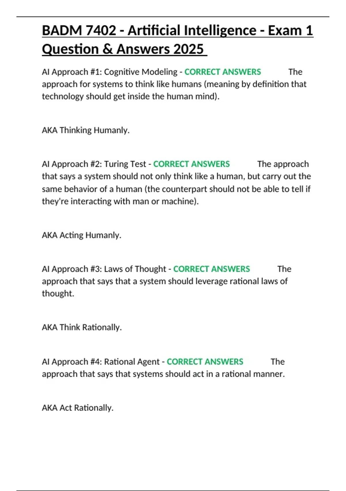 BADM 7402 - Artificial Intelligence - Exam 1 Question & Answers 2025.docx