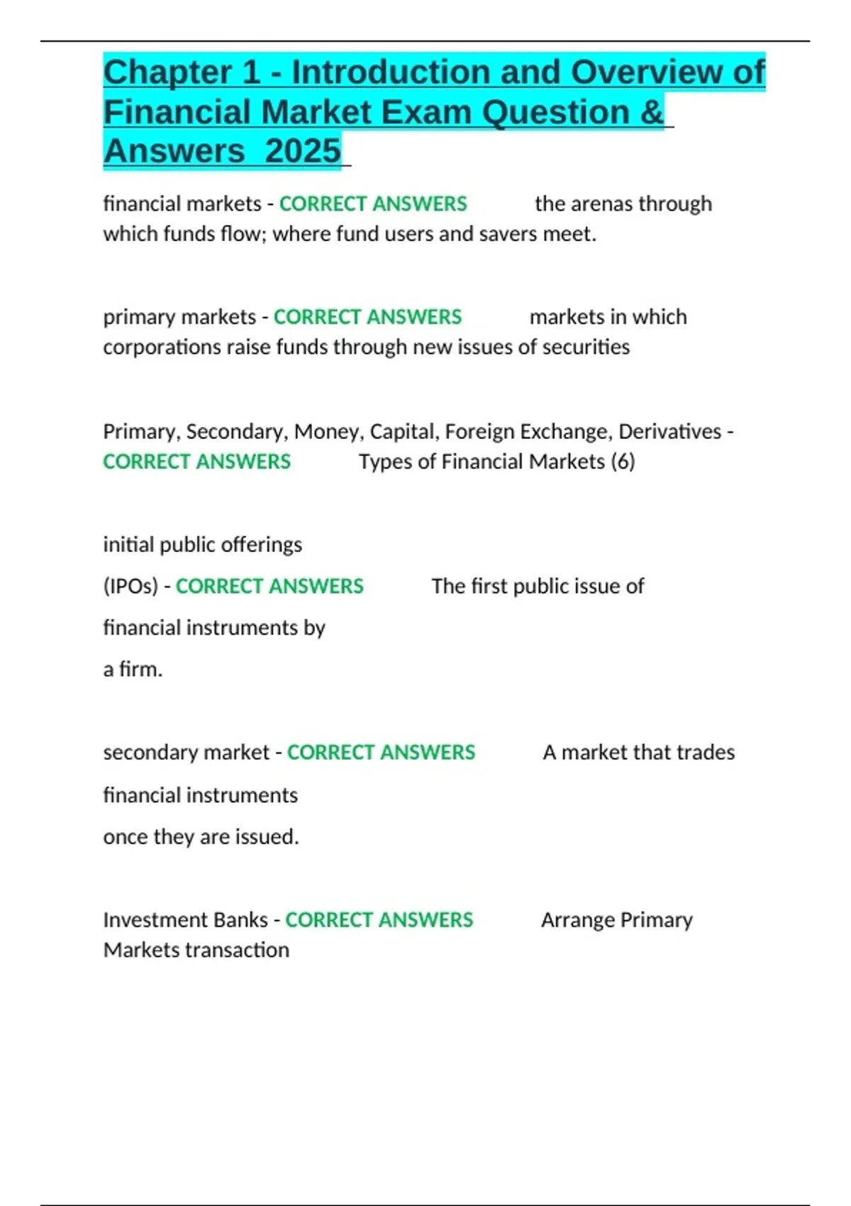 CORRECT ANSWERS ✔✔Types of Financial Markets (6)